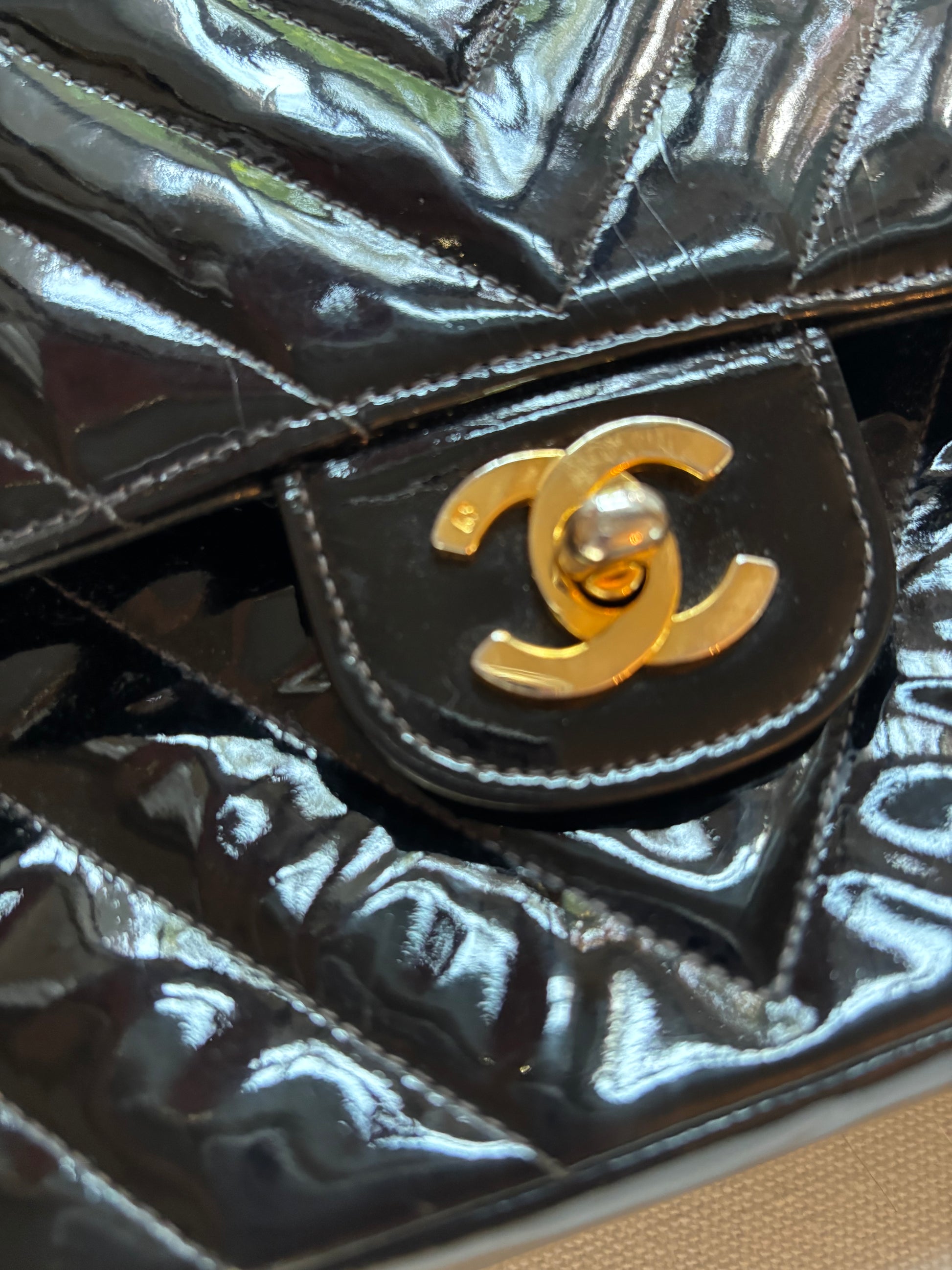 👜 Chanel Vintage Black Patent Chevron Double Flap Bag – Gold Hardware