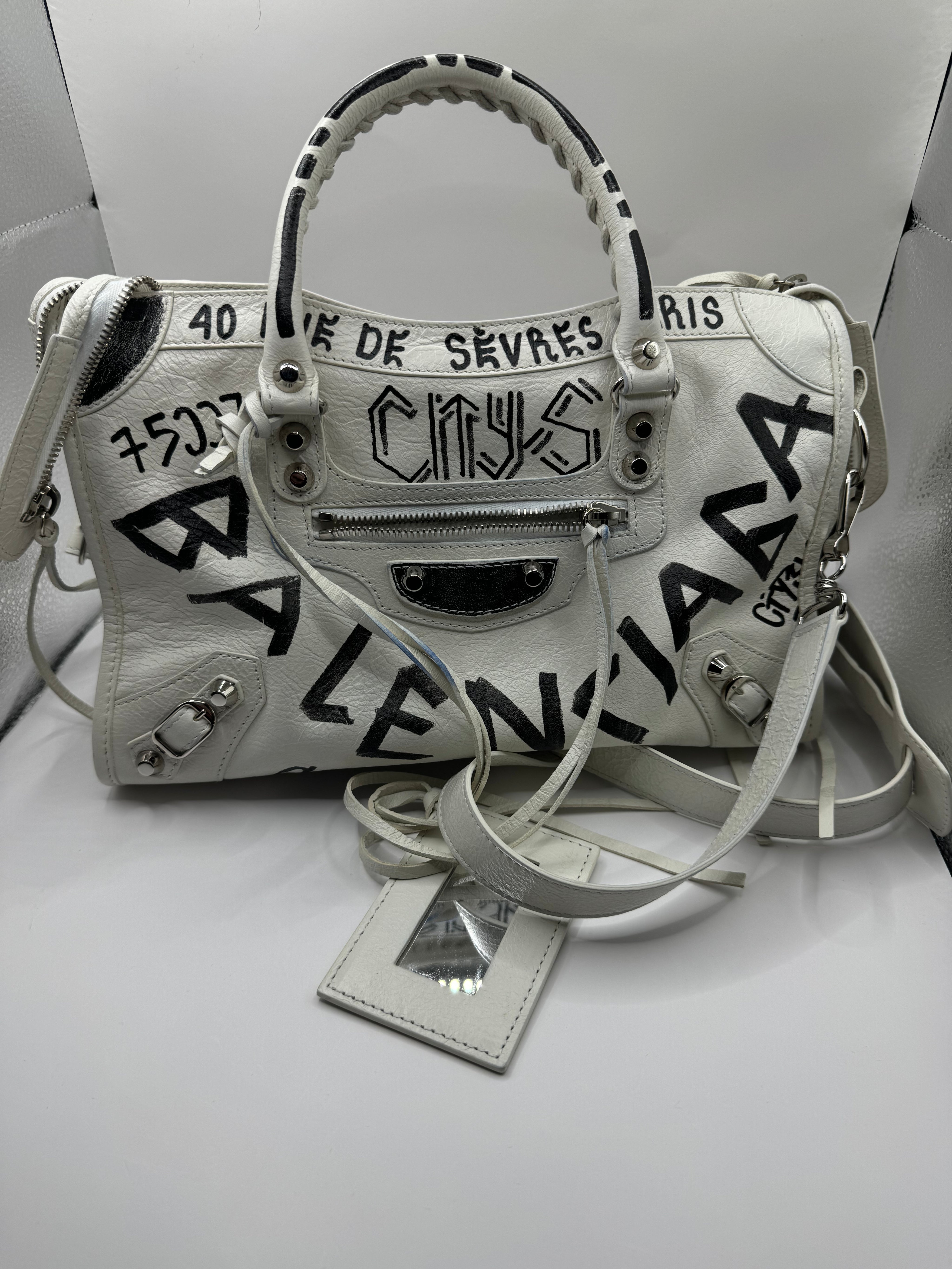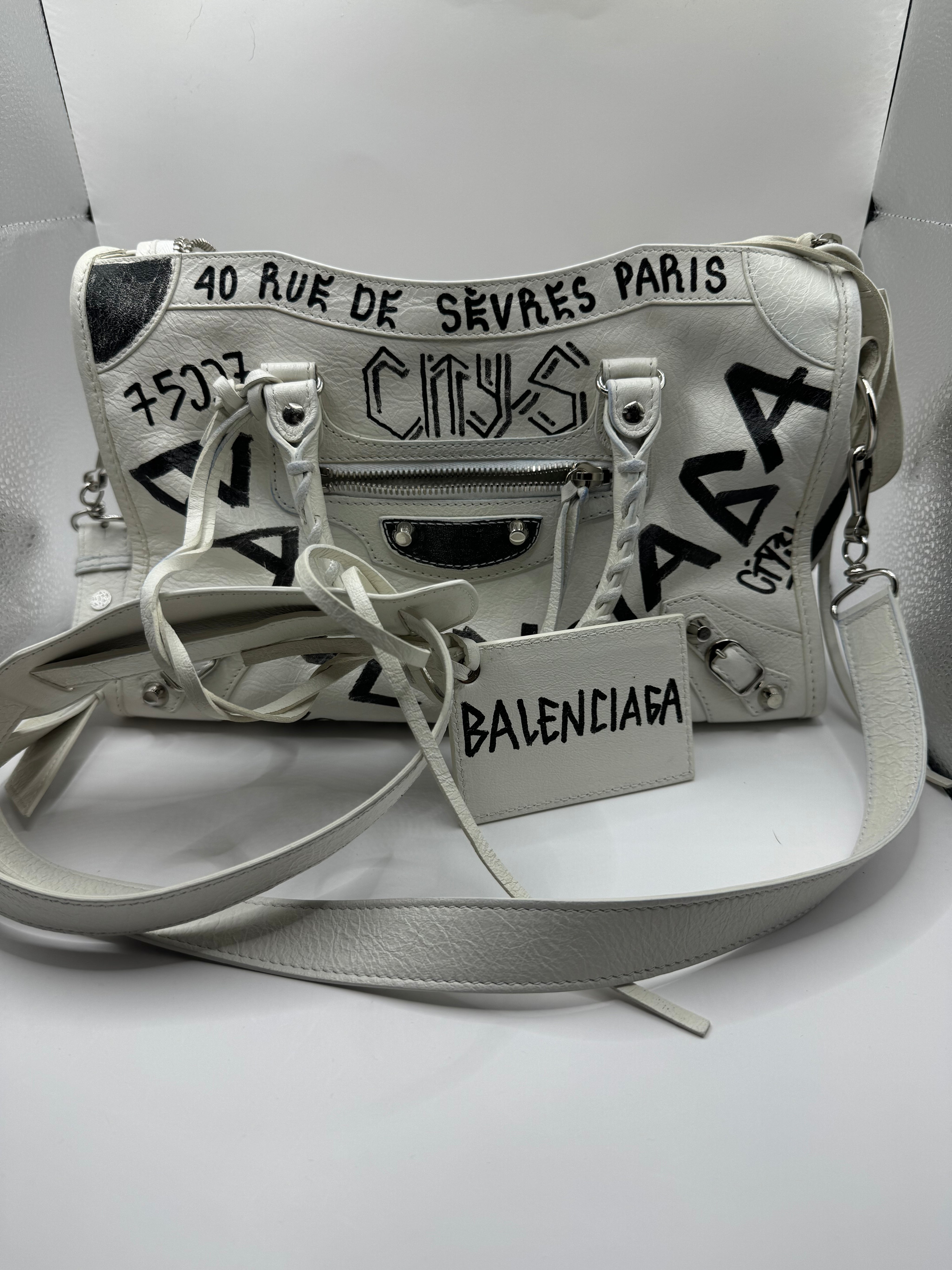 Balenciaga Limited Edition Classic City Graffiti Tote bag in white lambskin leather with graffiti print.