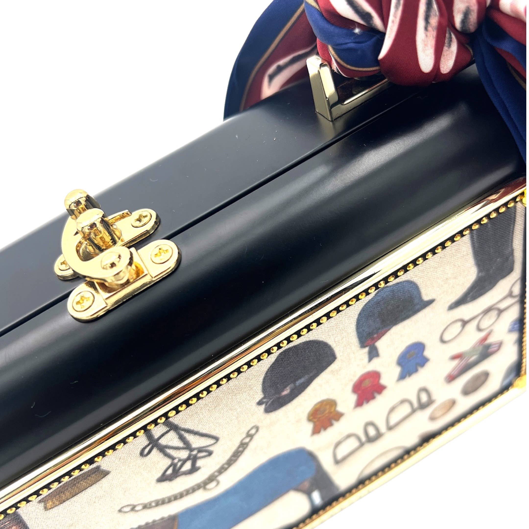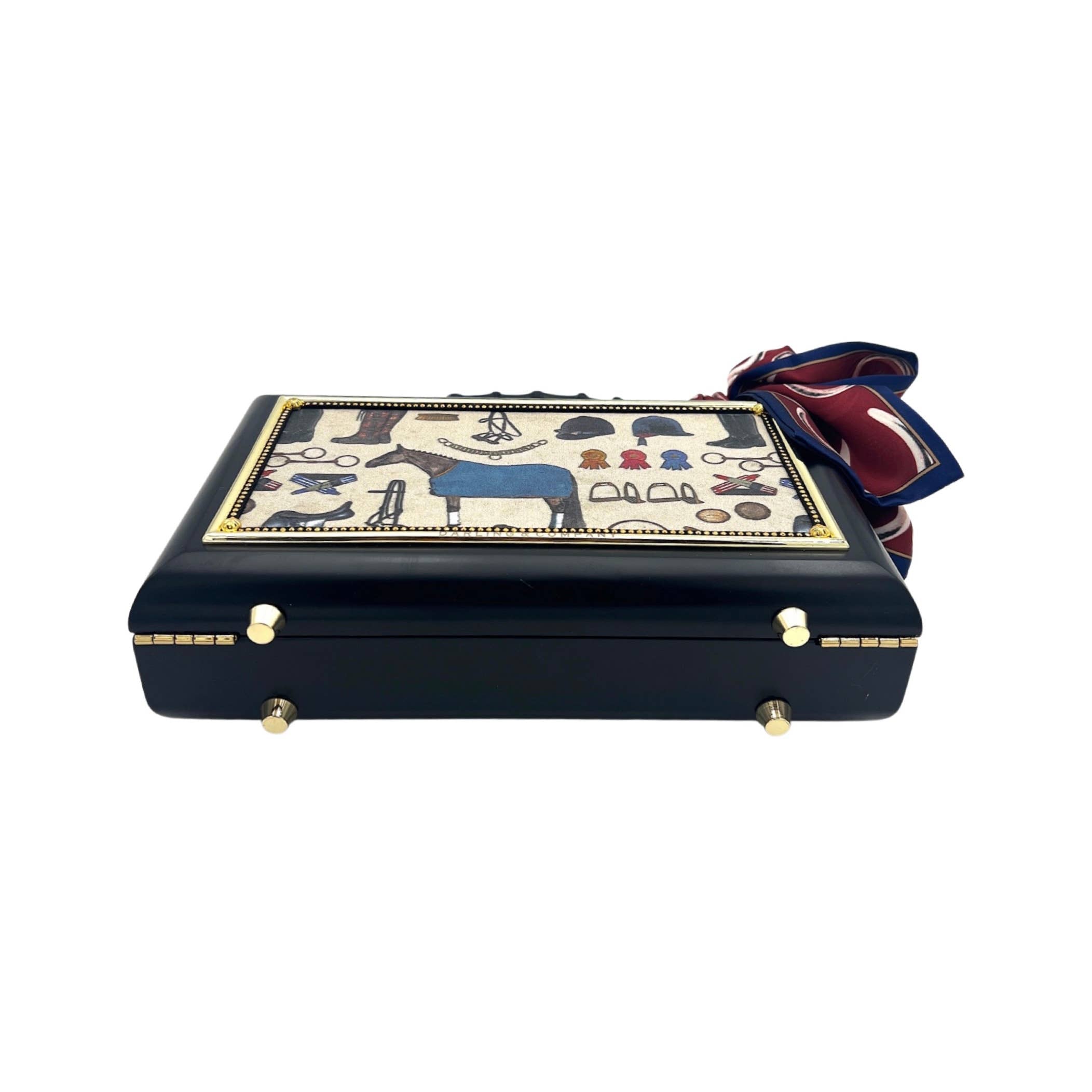 Other details include: skinny scarf, tassel dangling from black bamboo handle, and acid-protected hardware (clasp, hinges, and purse feet) have been added. Interior is finished with a velvety liner, pocket, and small mirror. The box is a durable, black satin mahogany.