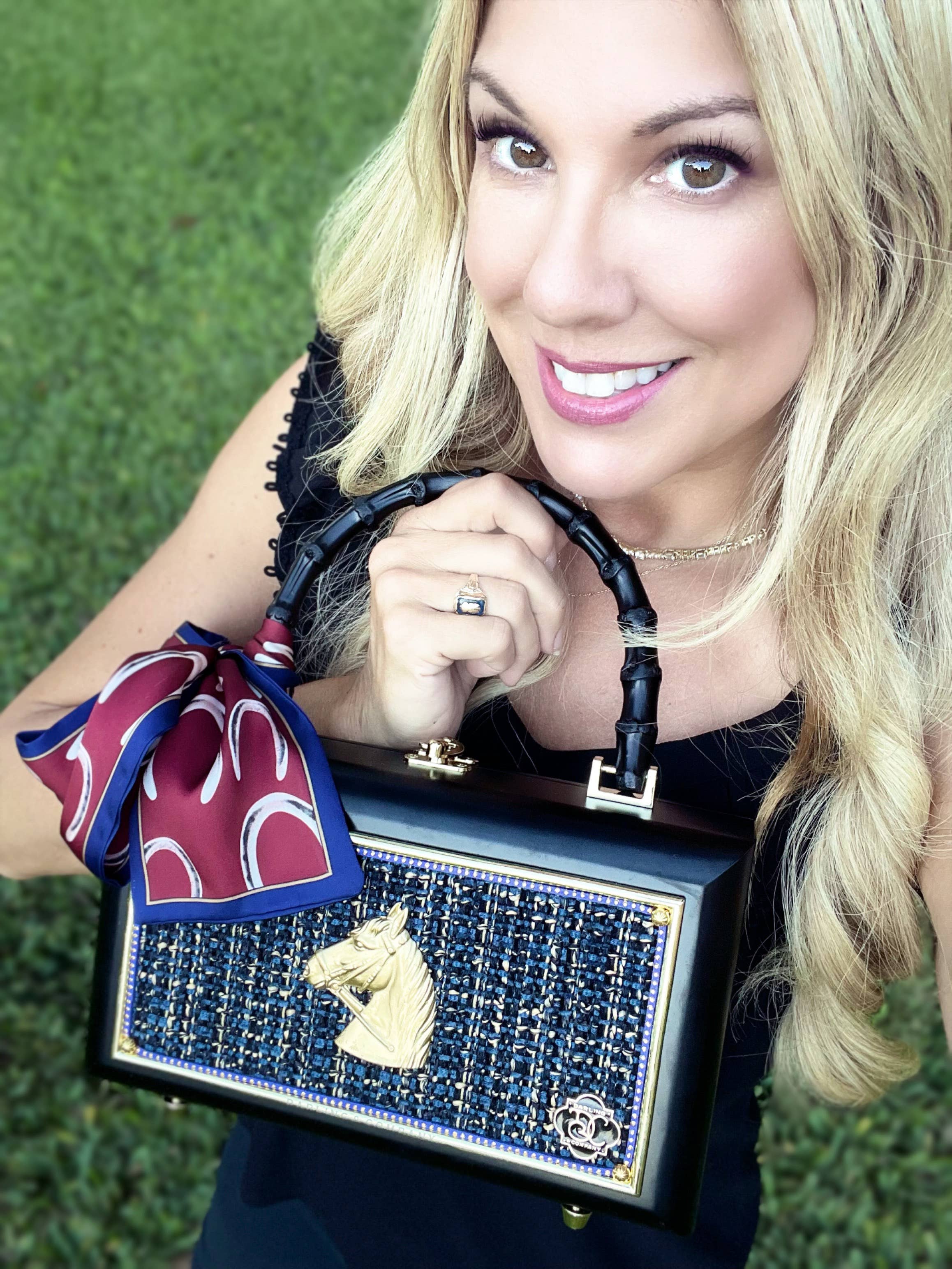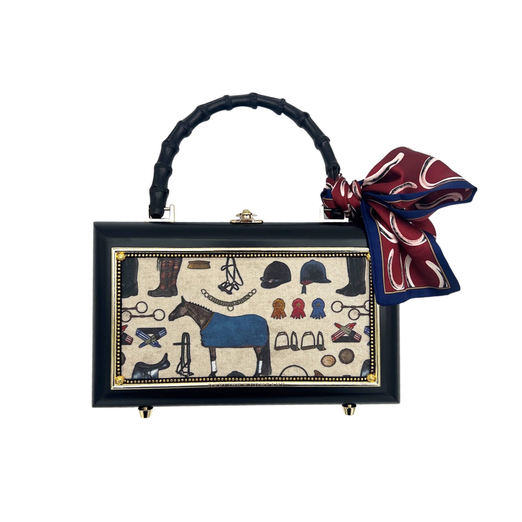 Features: equestrian theme fabric on the front; black, blue, gold tweed on the back with gold horse head embellishment; finished with our signature black and gold riveted suede trim.