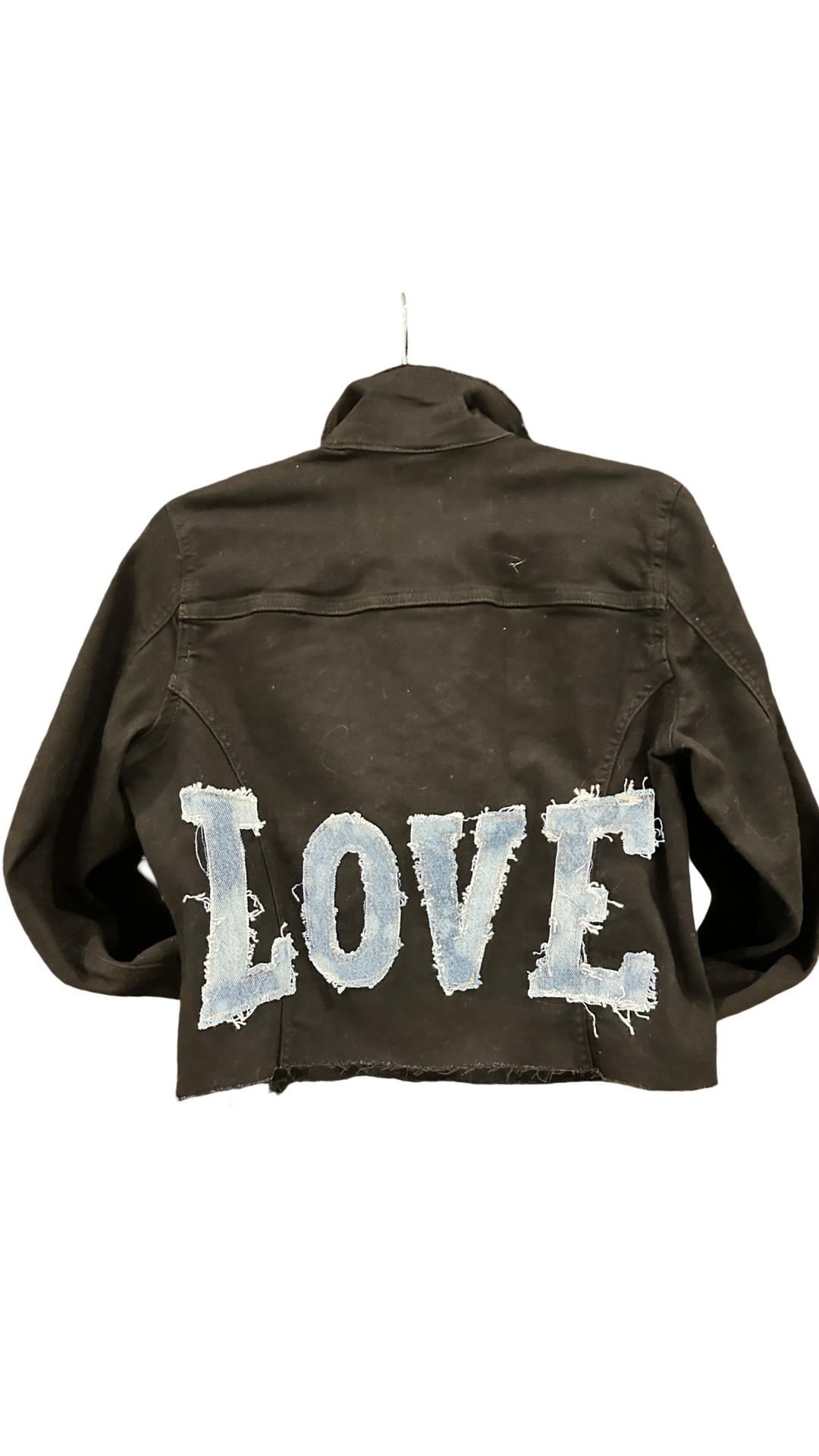 BLACK Denim Jean Jacket w/LOVE & HEARTS-Crystals at collar: Medium