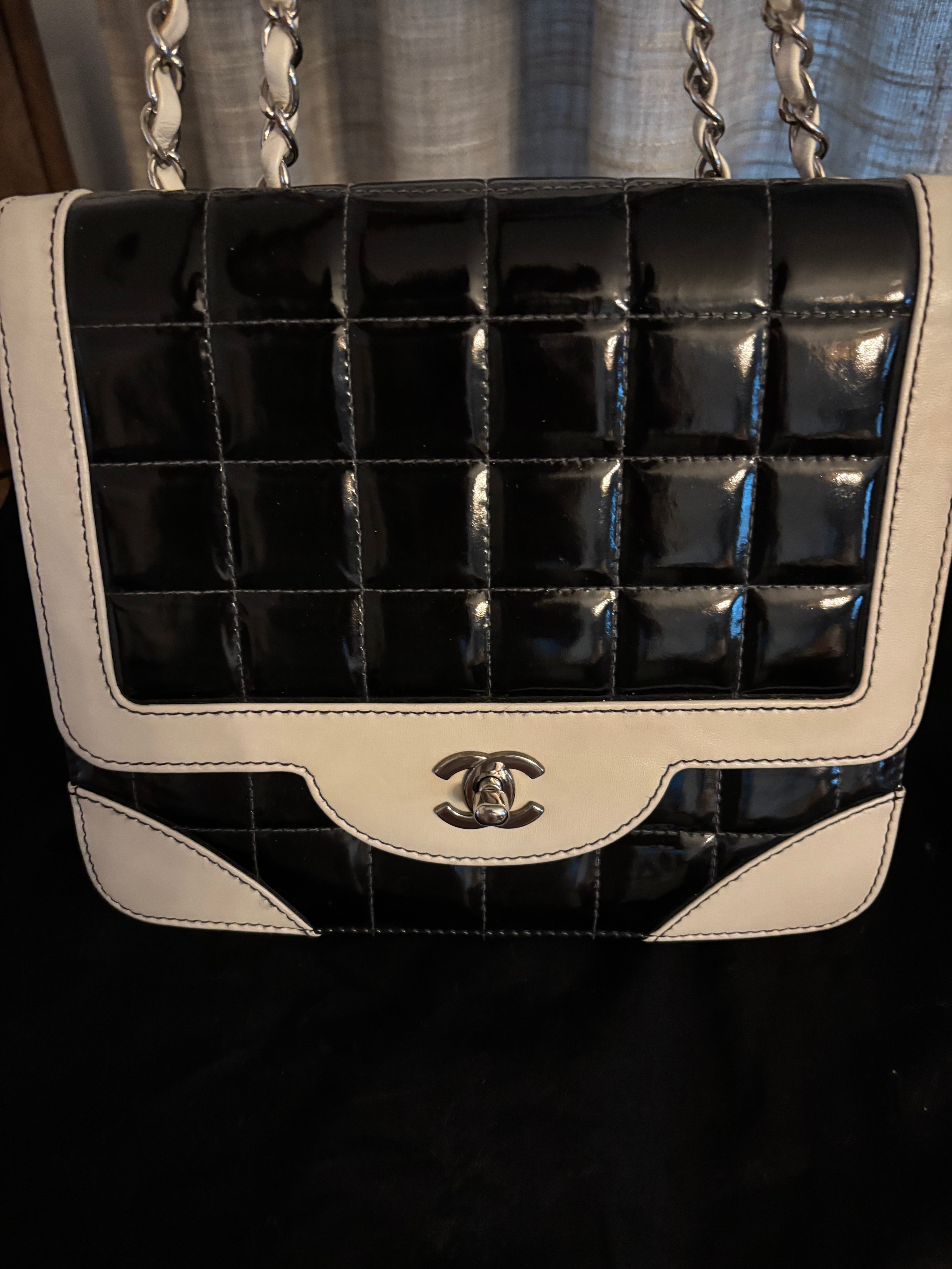 A rare and striking vintage Chanel flap, crafted in glossy black patent leather with bold white calfskin trim. Featuring oversized square quilting, silver-tone hardware, and Chanel’s signature CC turn-lock, this bag blends timeless elegance with a distinctive edge. The double chain strap interlaced with white leather allows for comfortable shoulder or crossbody wear.