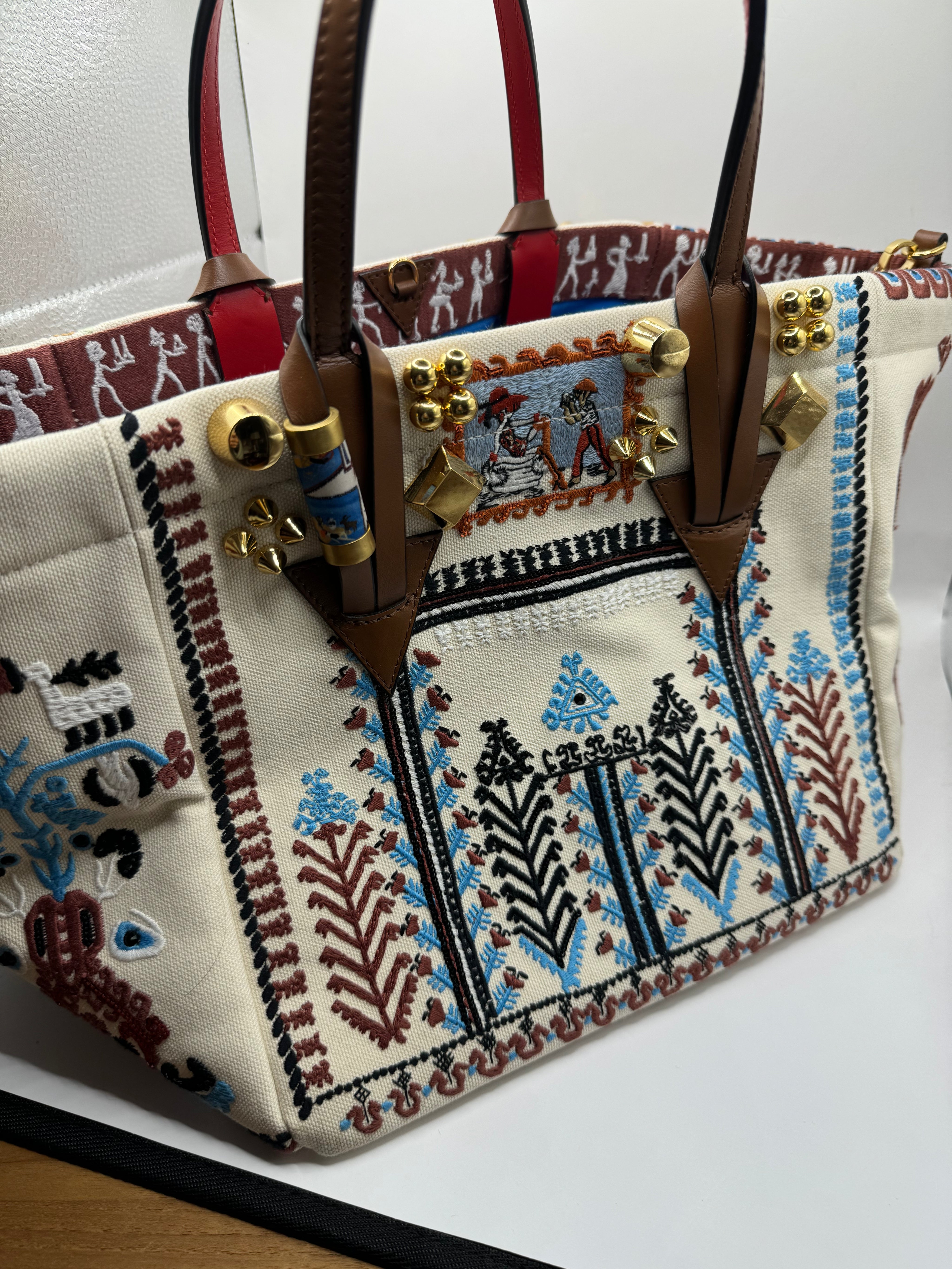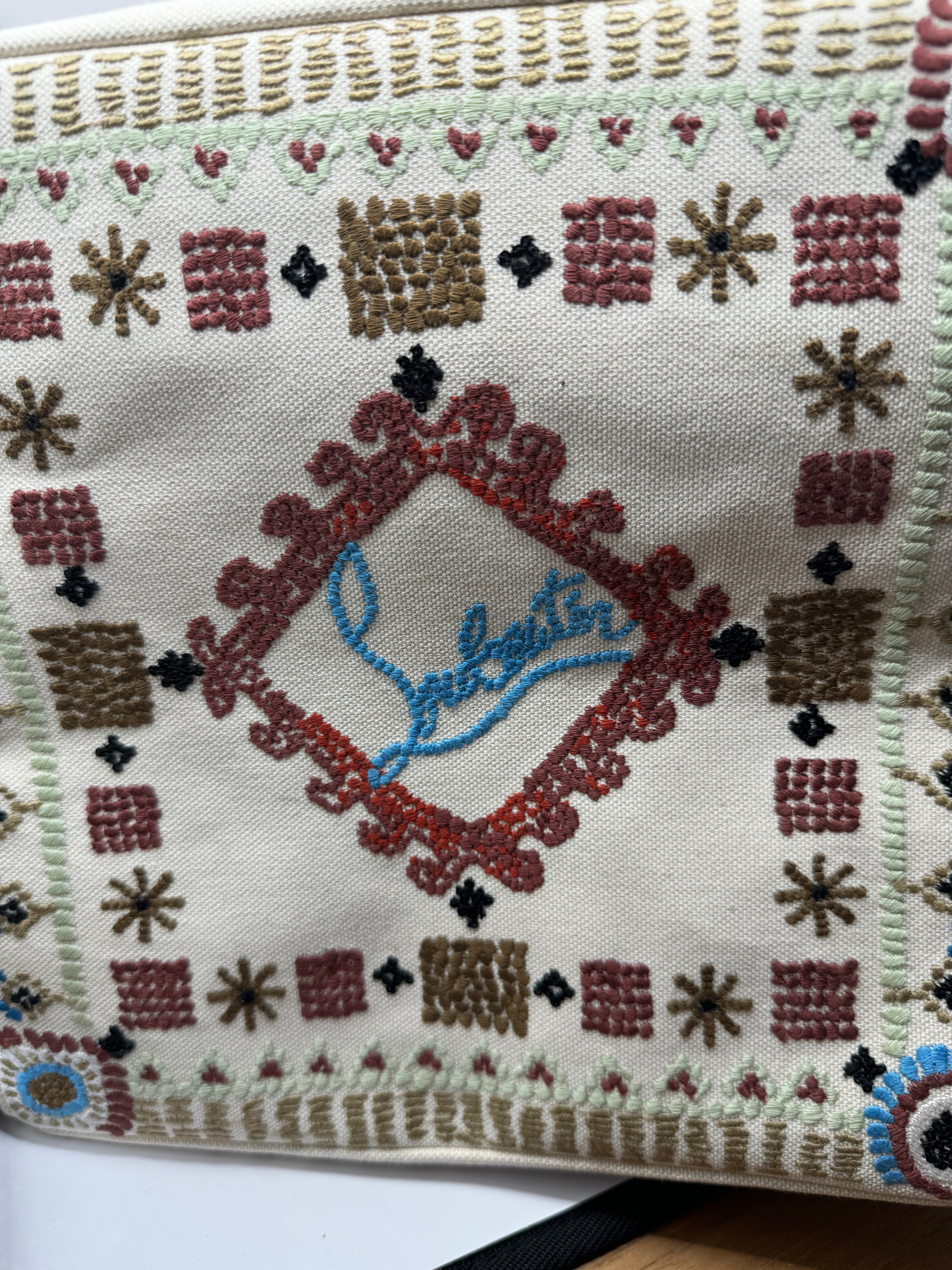 Konstantin Kakanias Greekaba leather trimmed embroidered bag. Handle drop 13cm, shoulder detachable strap length 112cm