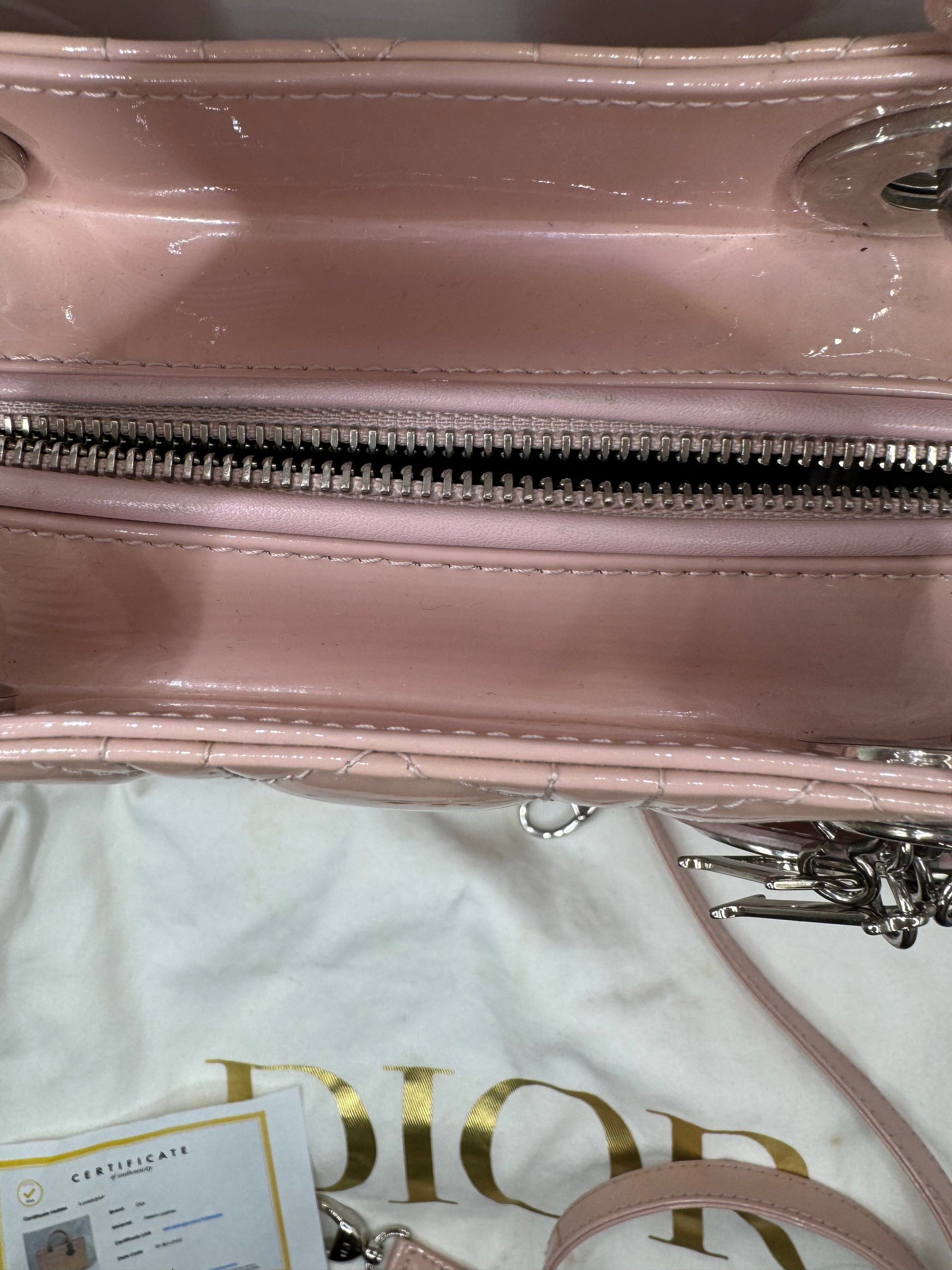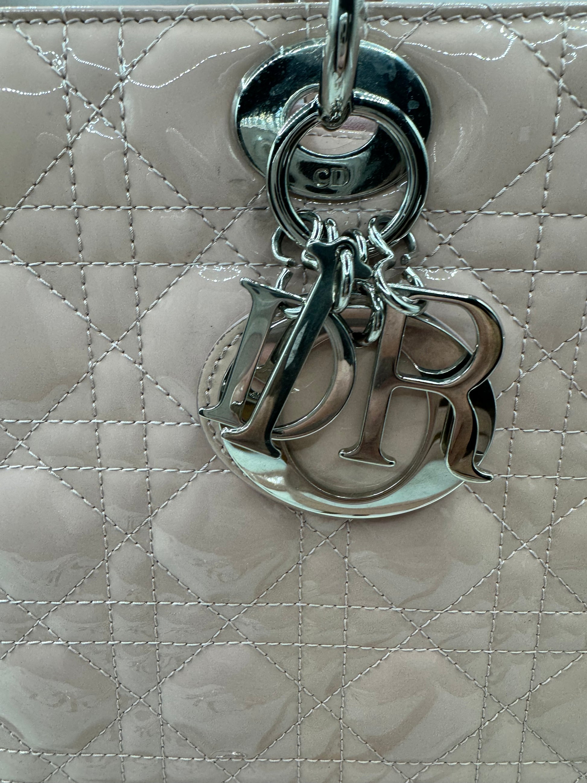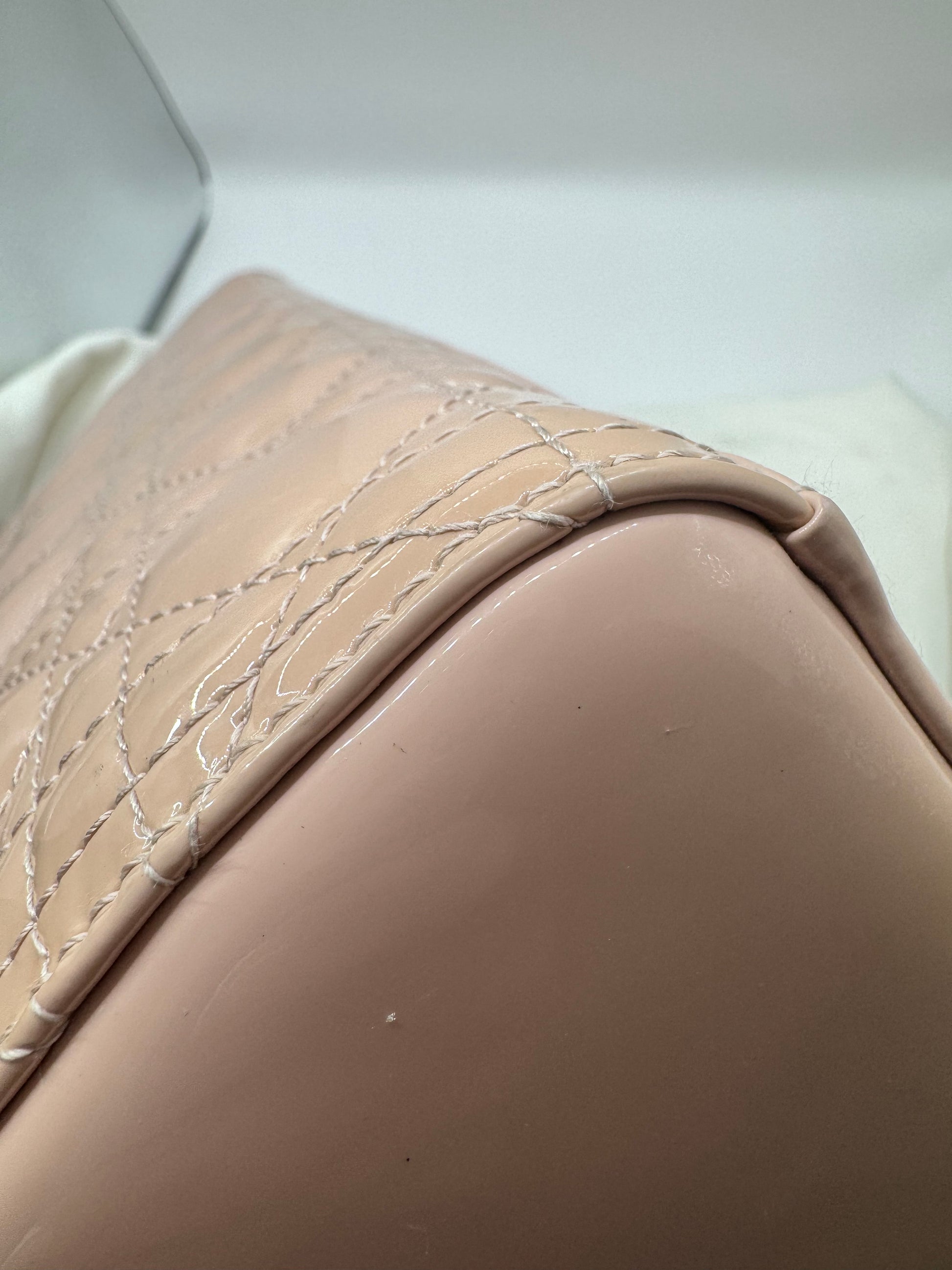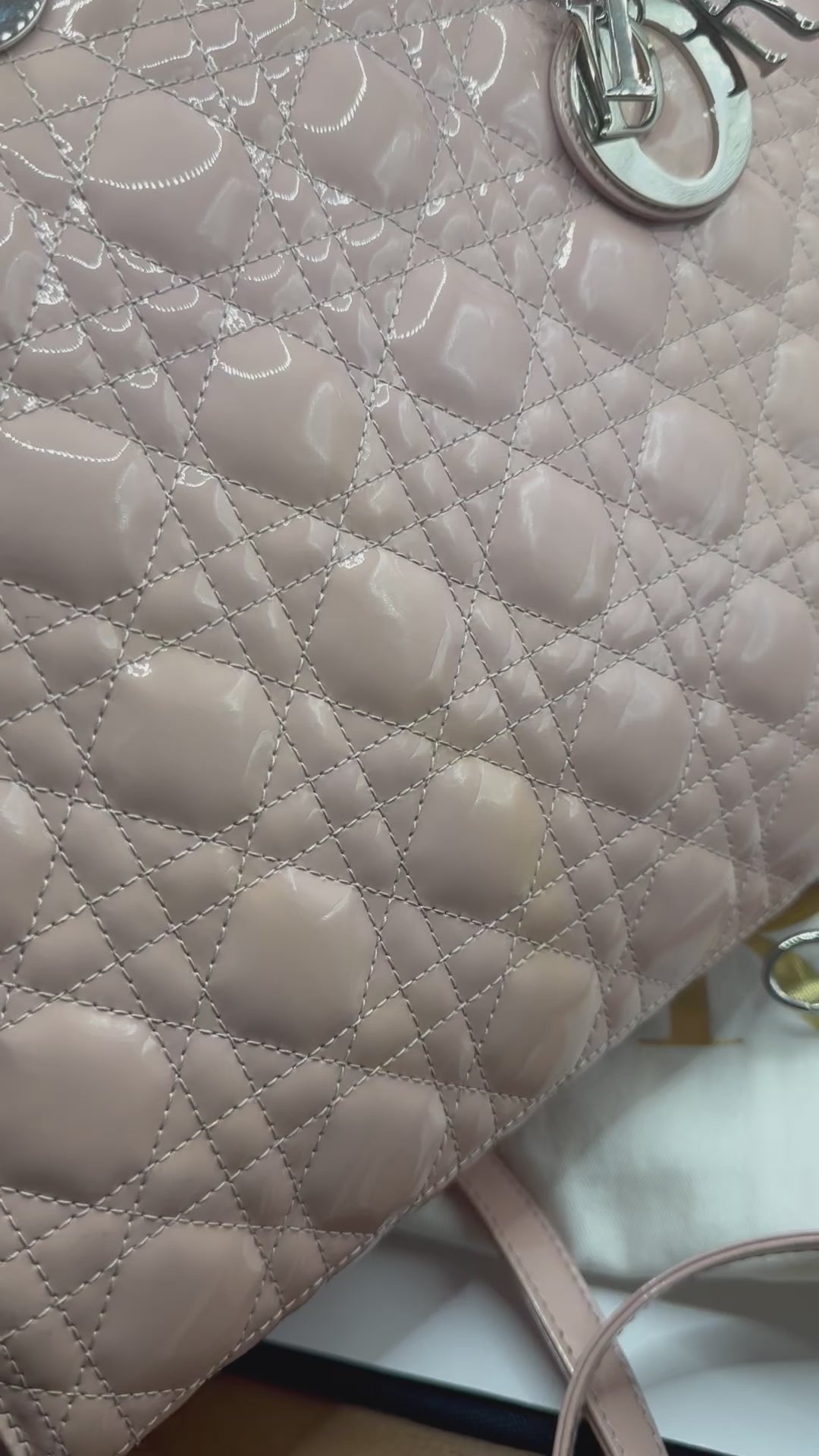 This stylish Christian Dior Lady Dior Large bag is crafted of luxurious geometric cannage quilted pink patent leather. This bag is truly timeless and has become one of Dior’s most iconic bag style. This beauty is accentuated with sturdy round handles and D.I.O.R charms. This is absolutely a collector's item for any handbag enthusiast.