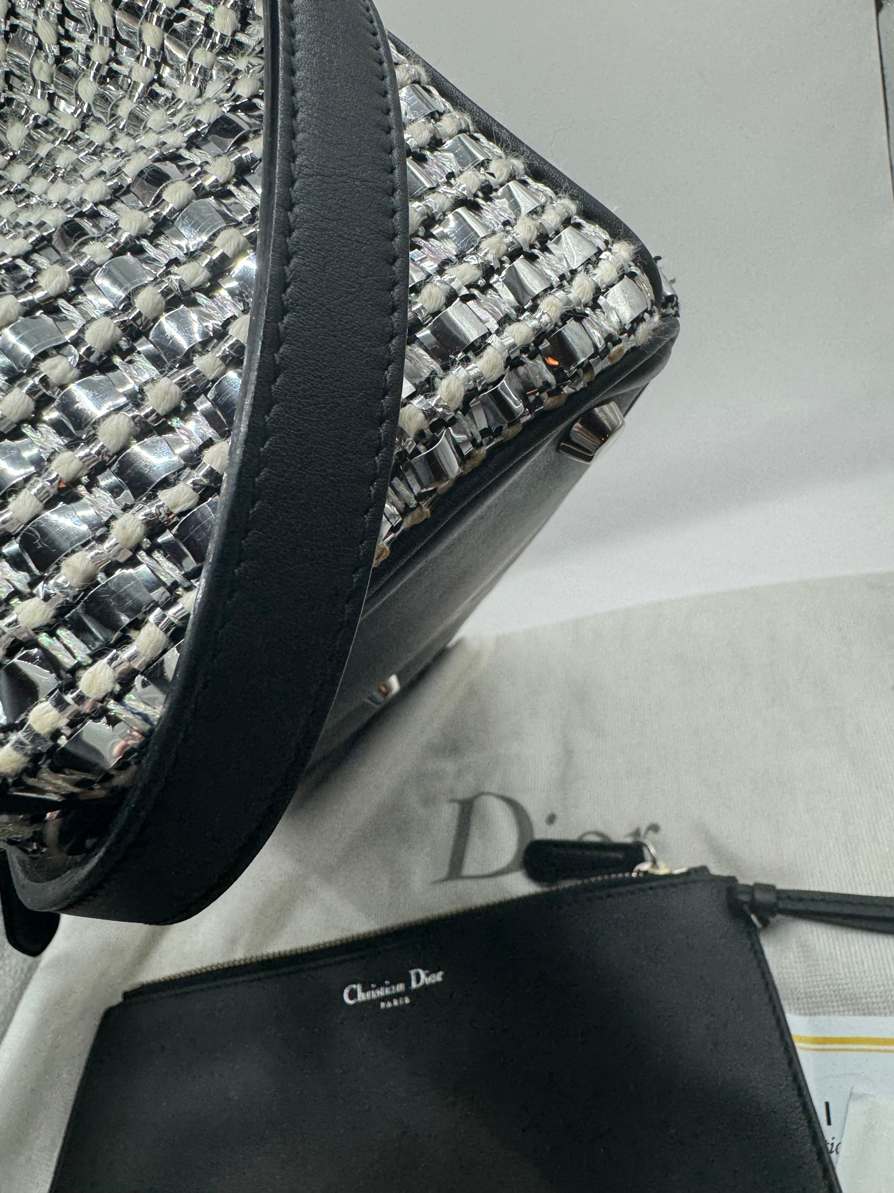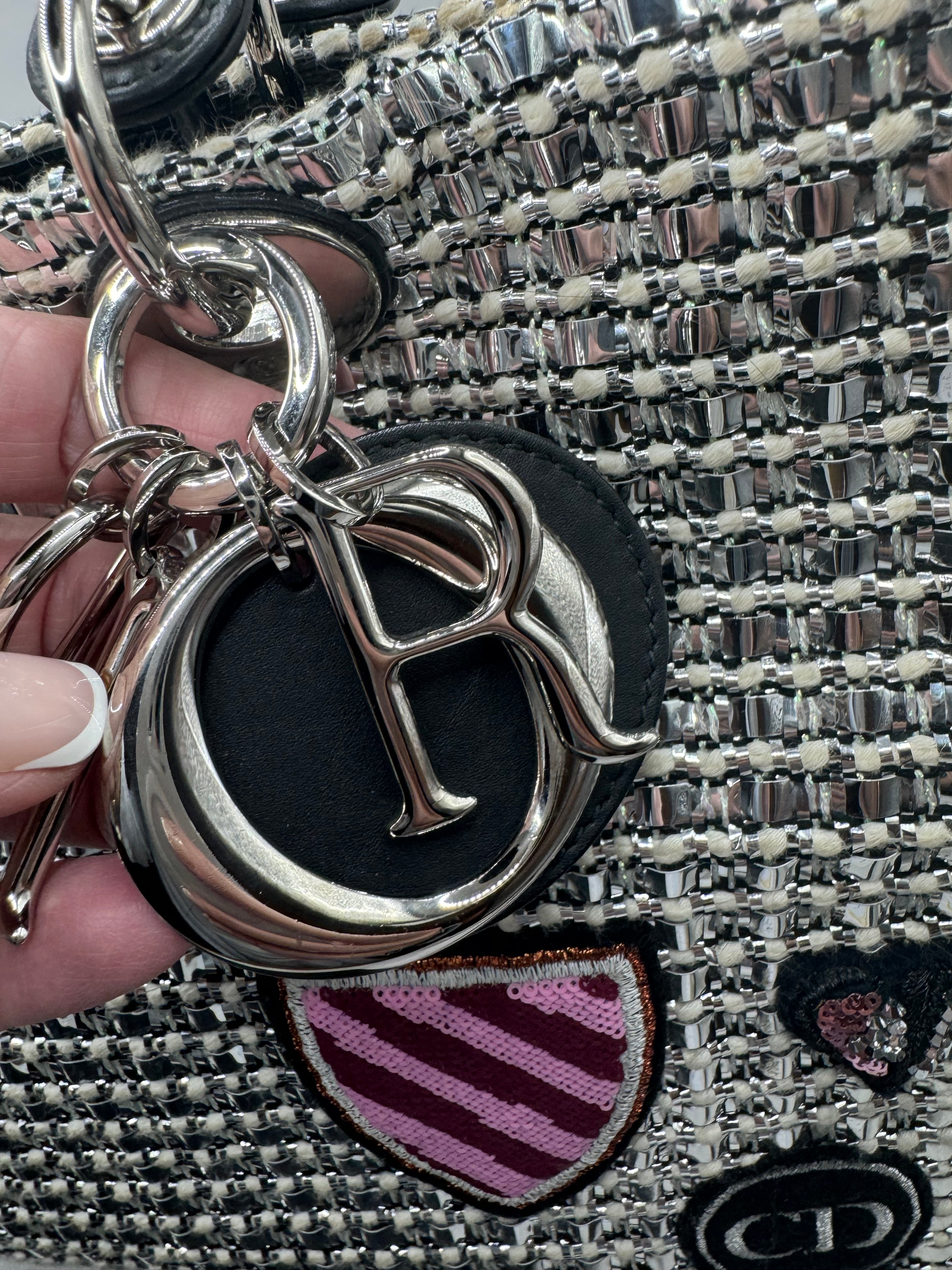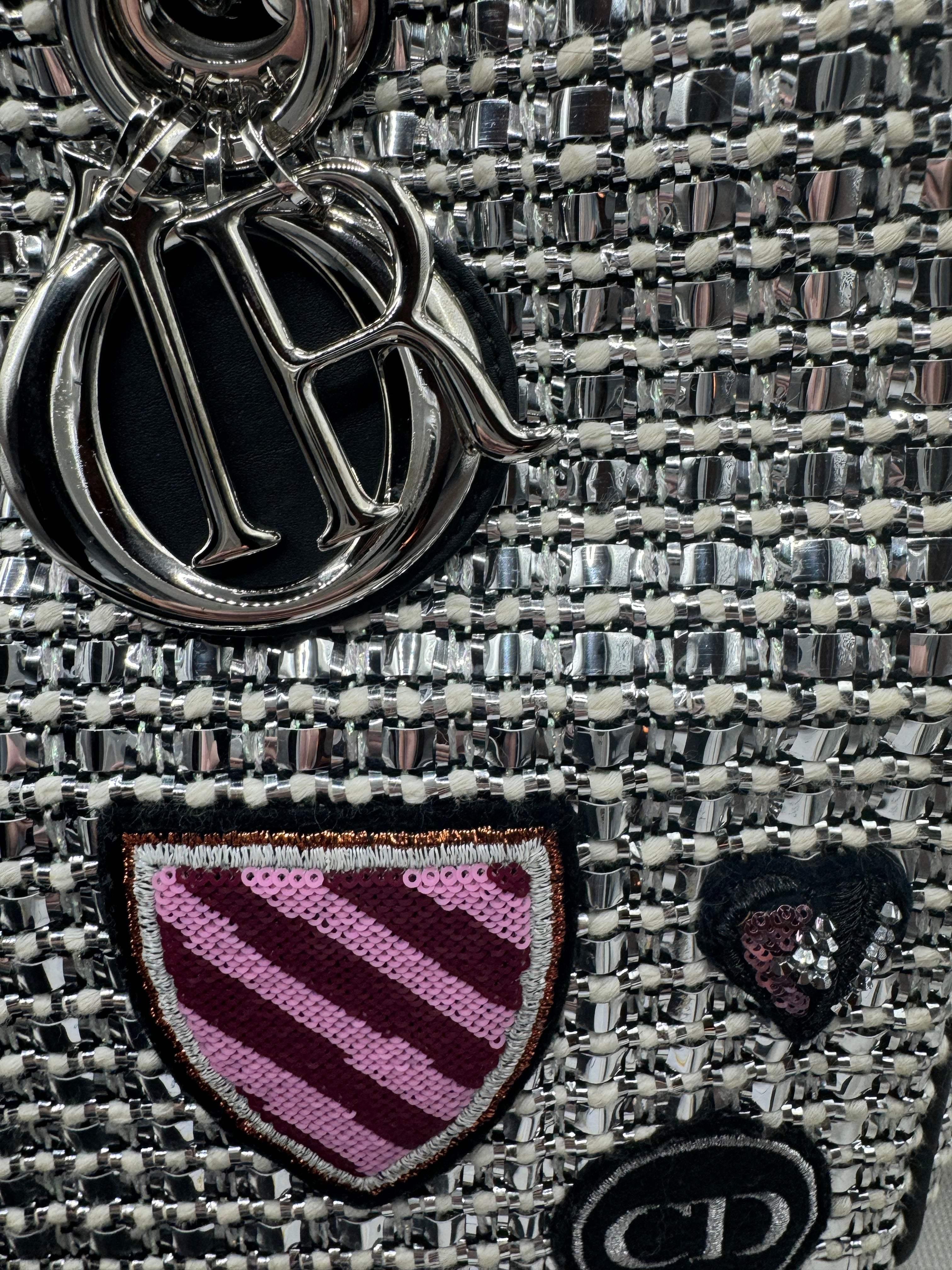 A rare collector’s piece, this Christian Dior Limited Edition Diorissimo Tote is crafted in shimmering metallic tweed with sleek black leather handles and silver-tone hardware. Embellished with bold embroidered patches and Dior’s iconic oversized charms, it’s a statement design that elevates the classic Diorissimo silhouette. Spacious and structured, this tote blends luxury craftsmanship with modern edge.