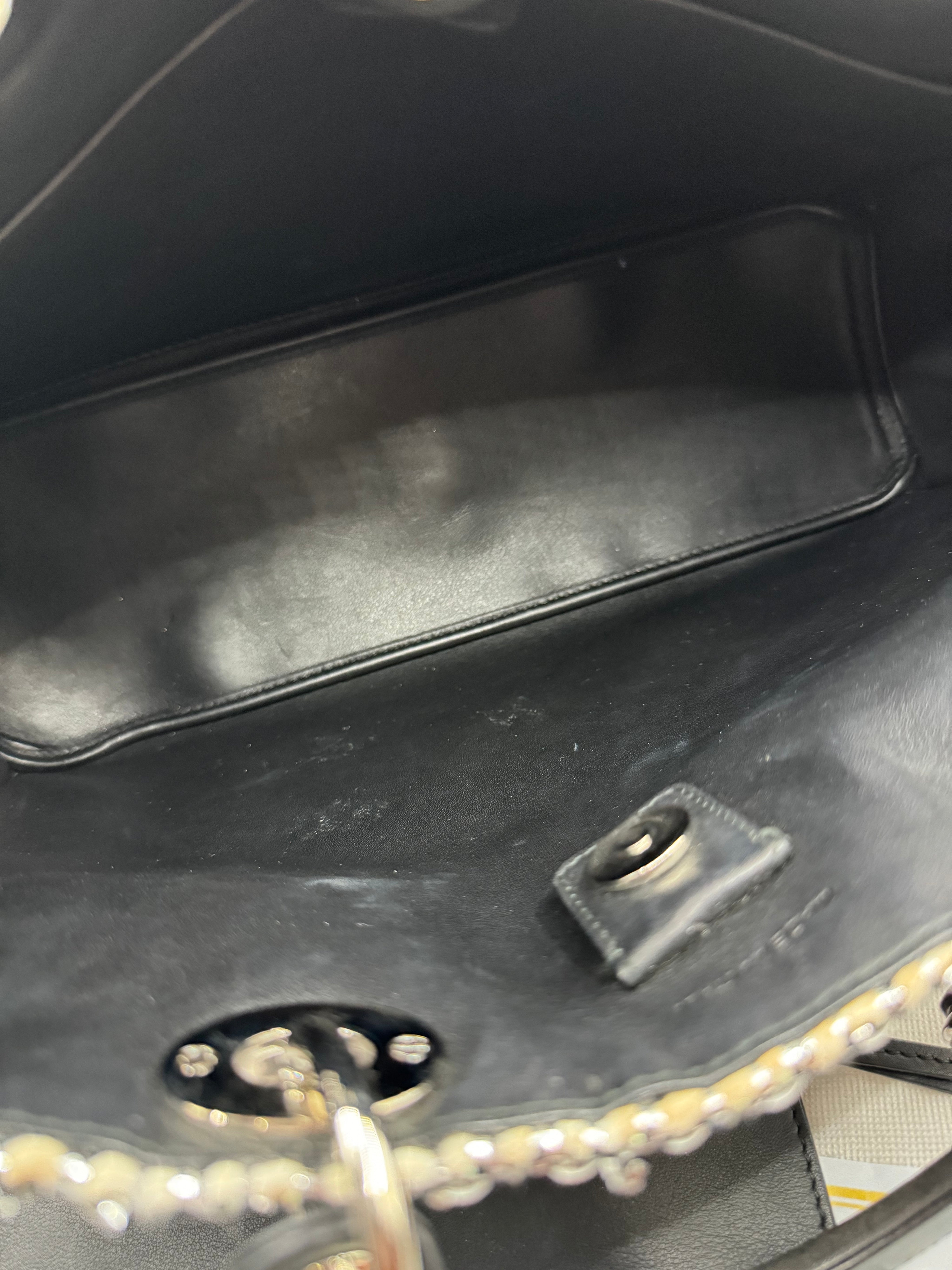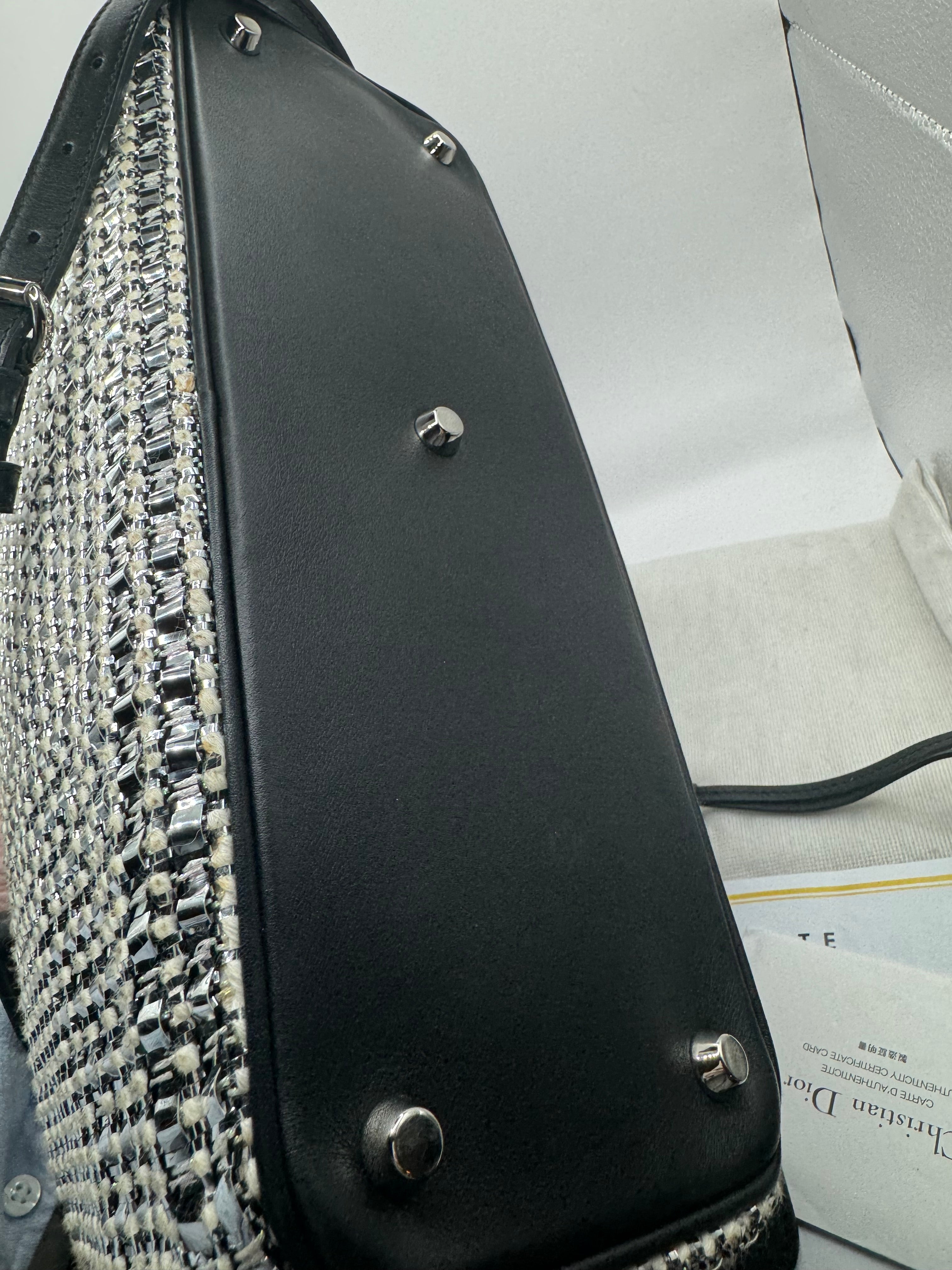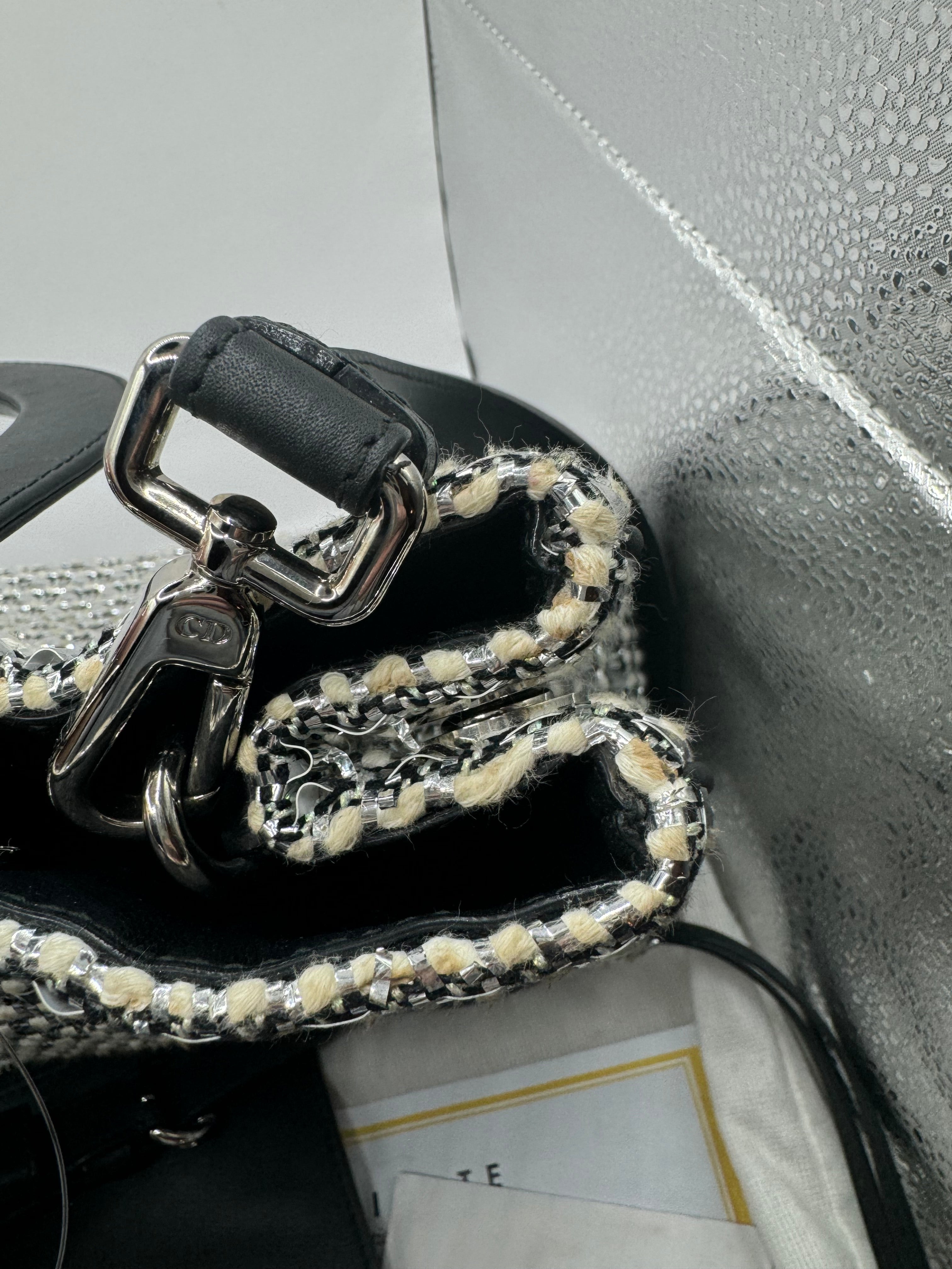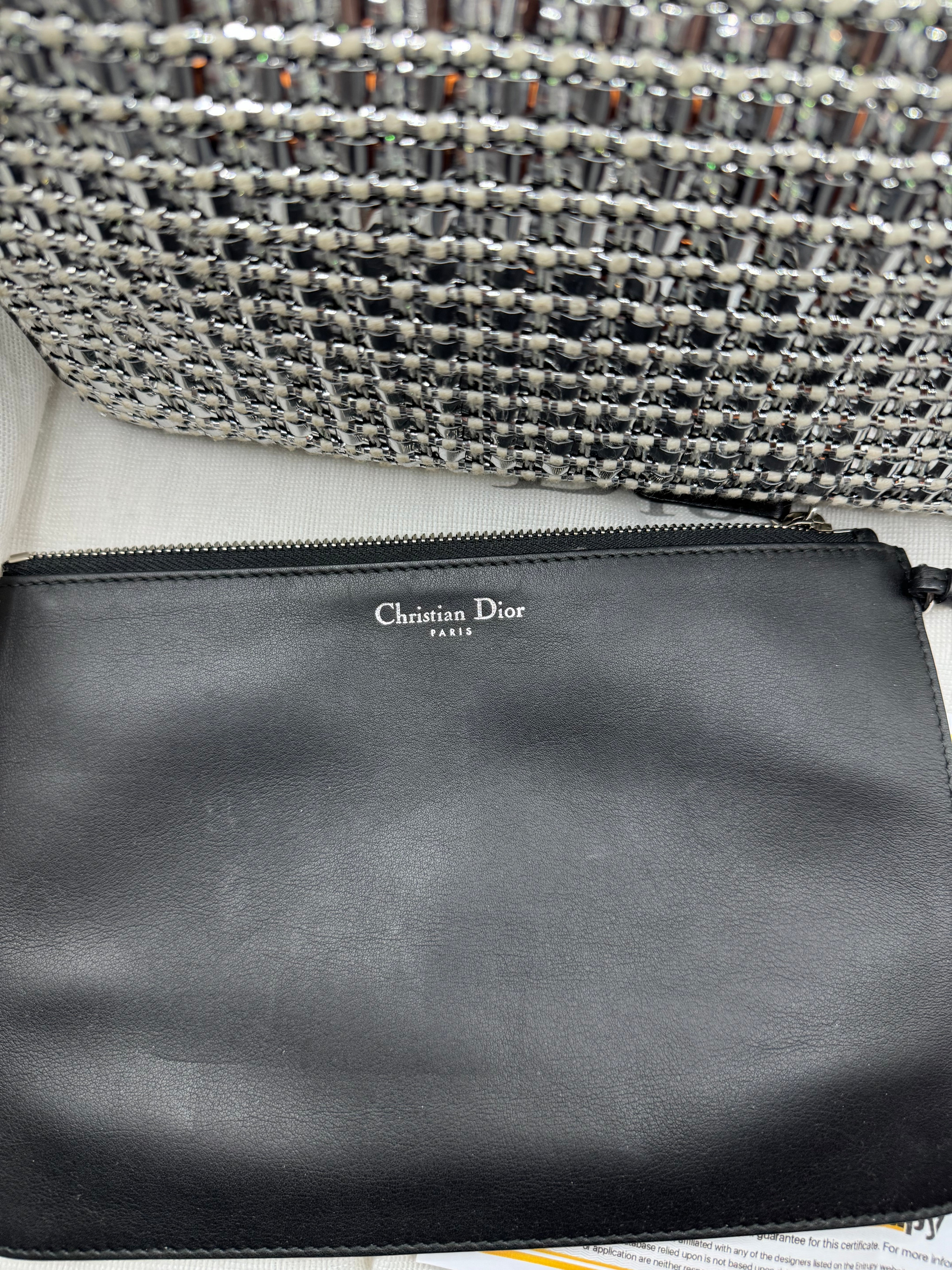 A rare collector’s piece, this Christian Dior Limited Edition Diorissimo Tote is crafted in shimmering metallic tweed with sleek black leather handles and silver-tone hardware. Embellished with bold embroidered patches and Dior’s iconic oversized charms, it’s a statement design that elevates the classic Diorissimo silhouette. Spacious and structured, this tote blends luxury craftsmanship with modern edge.