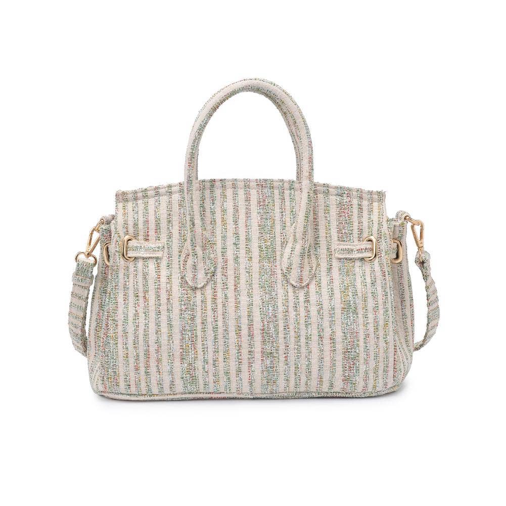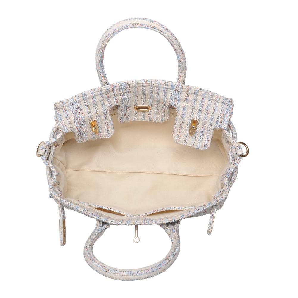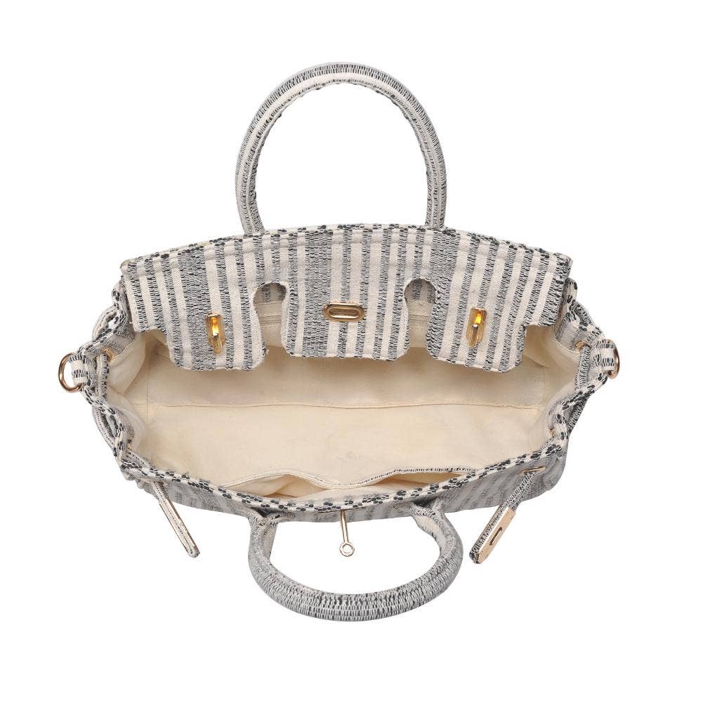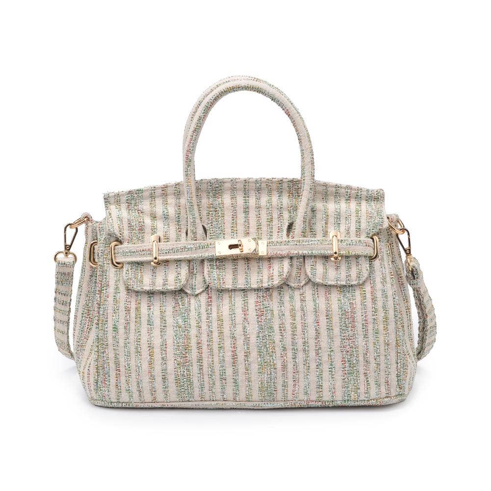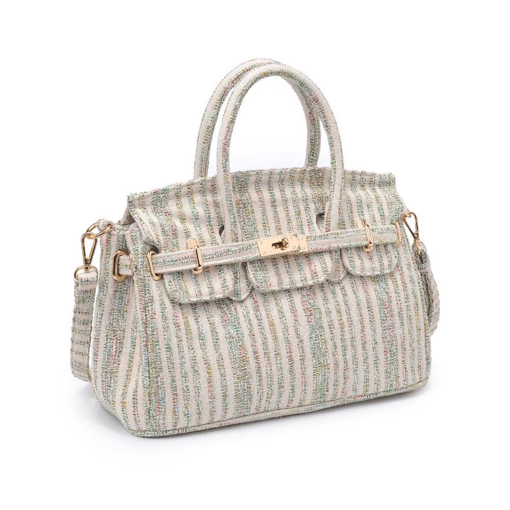 Blossom into style with our printed fabric satchel featuring gold hardware and a versatile top handle. The turn-lock closure adds a touch of sophistication, and the adjustable shoulder strap offers convenience on the move. Organize your essentials effortlessly with the fabric-lined interior and multiple pockets. Elevate your fashion game with this chic and practical satchel!