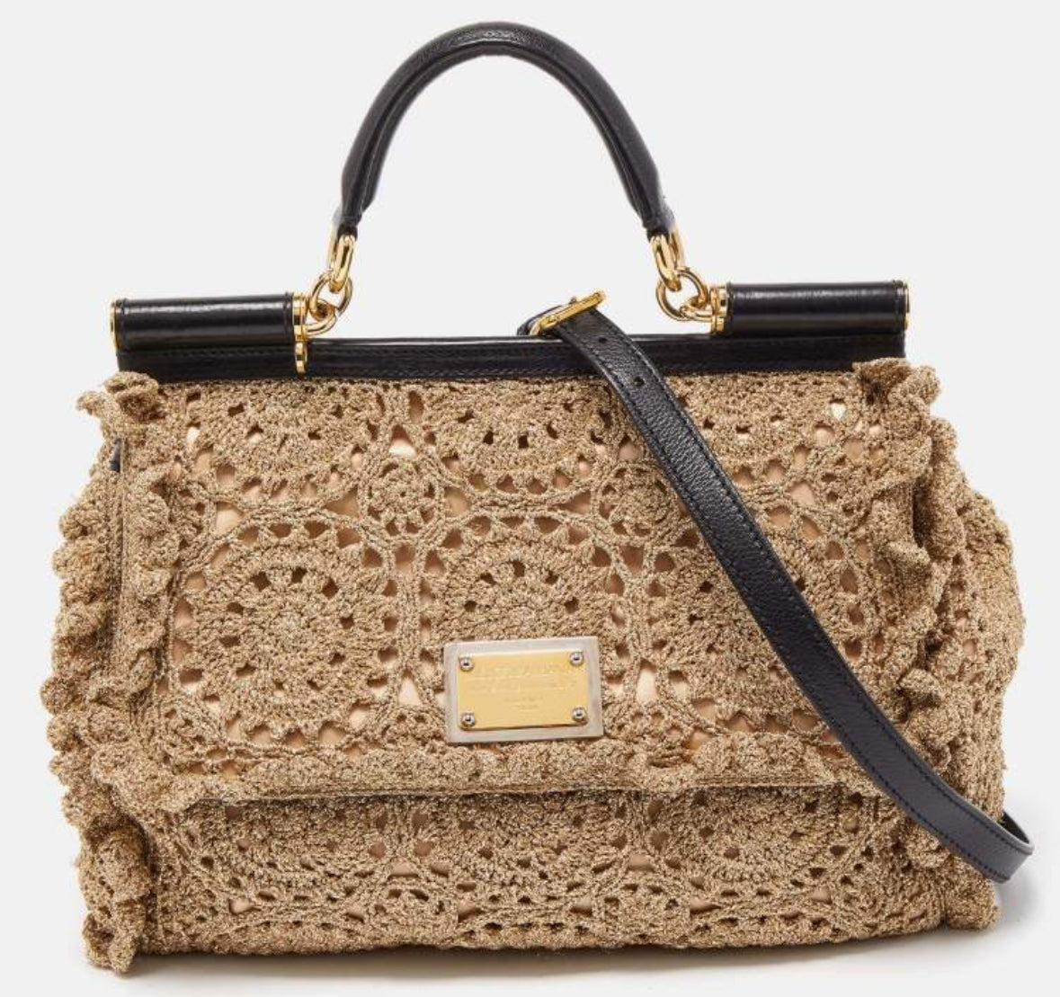 The Miss Sicily range of bags is one of the most celebrated creations from Dolce & Gabbana. Crafted from crochet lurex fabric & leather, this gold version has the signature flap, top handle, and a detachable strap.