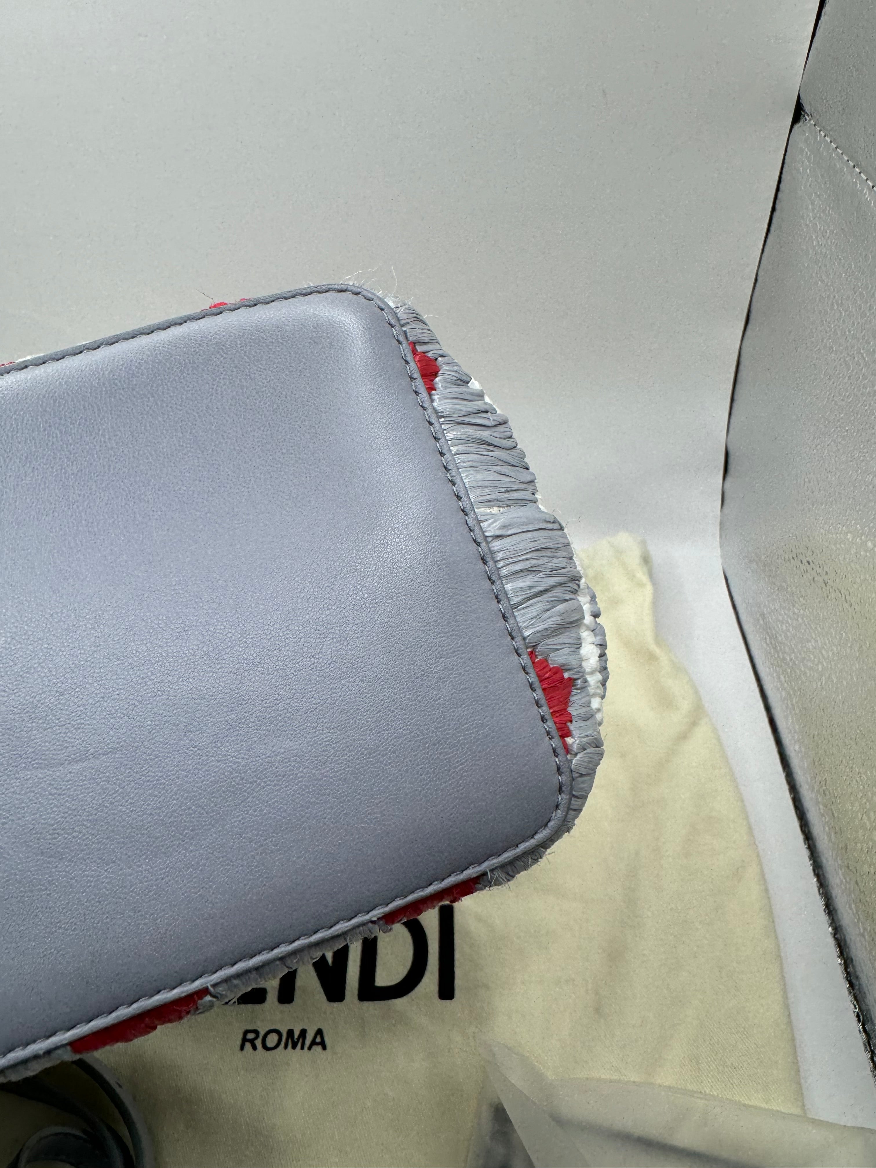 The Fendi Mini Peekaboo features an embroidered raffia body with leather trim, a flat top handle, a detachable flat strap, and a silver-tone turnbuckle closure.