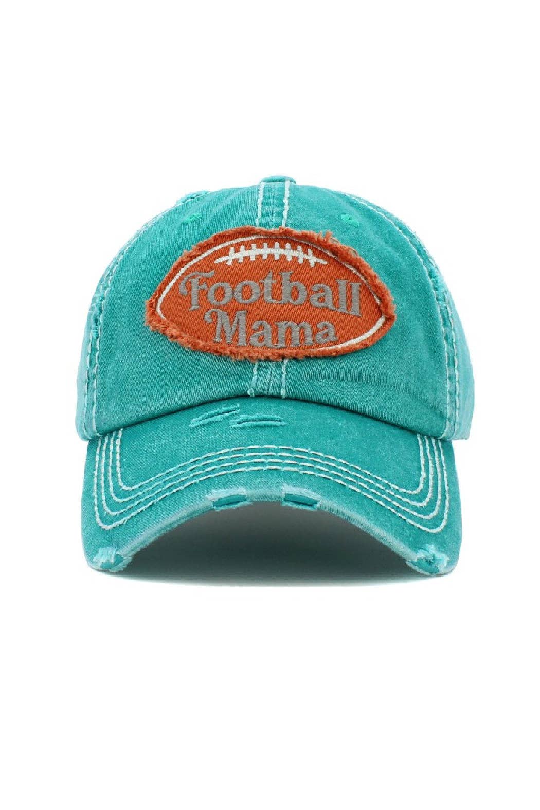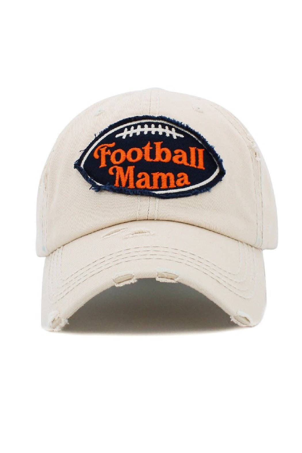 Distressed baseball cap with football patch. This patch has details of football laces and "Football Mama" embroidered on it. Adjustable velcro strap in the back. 100% cotton.