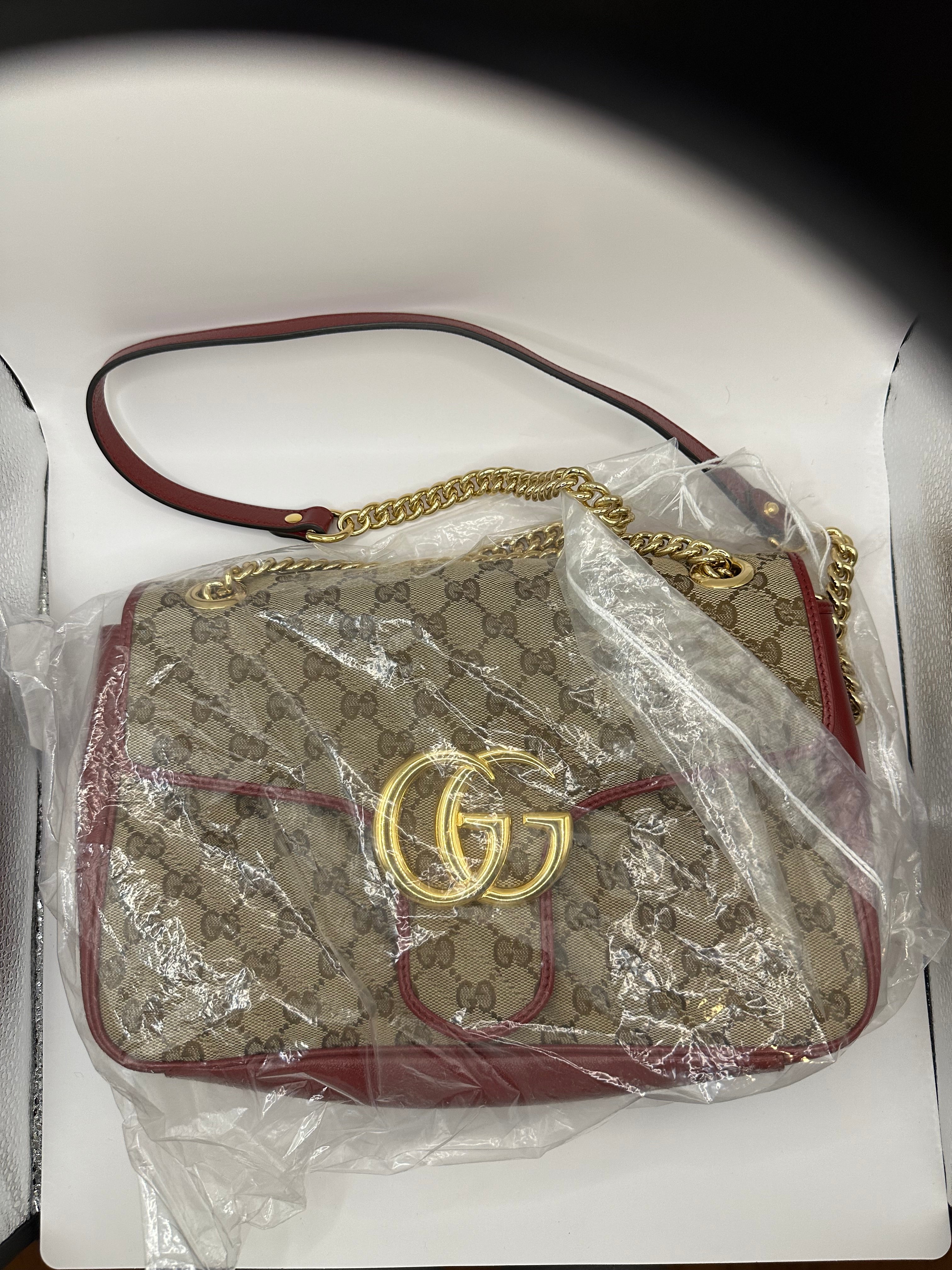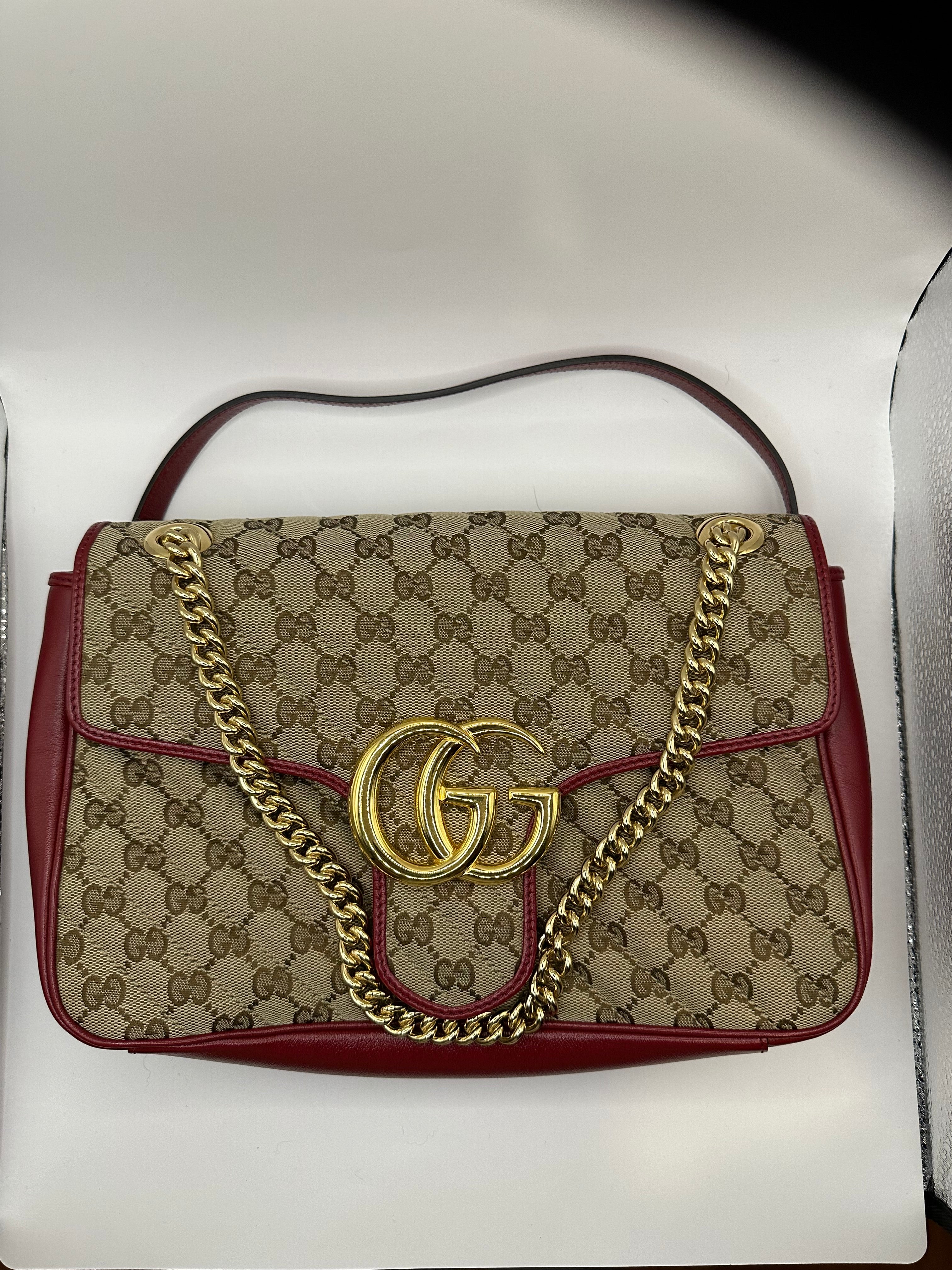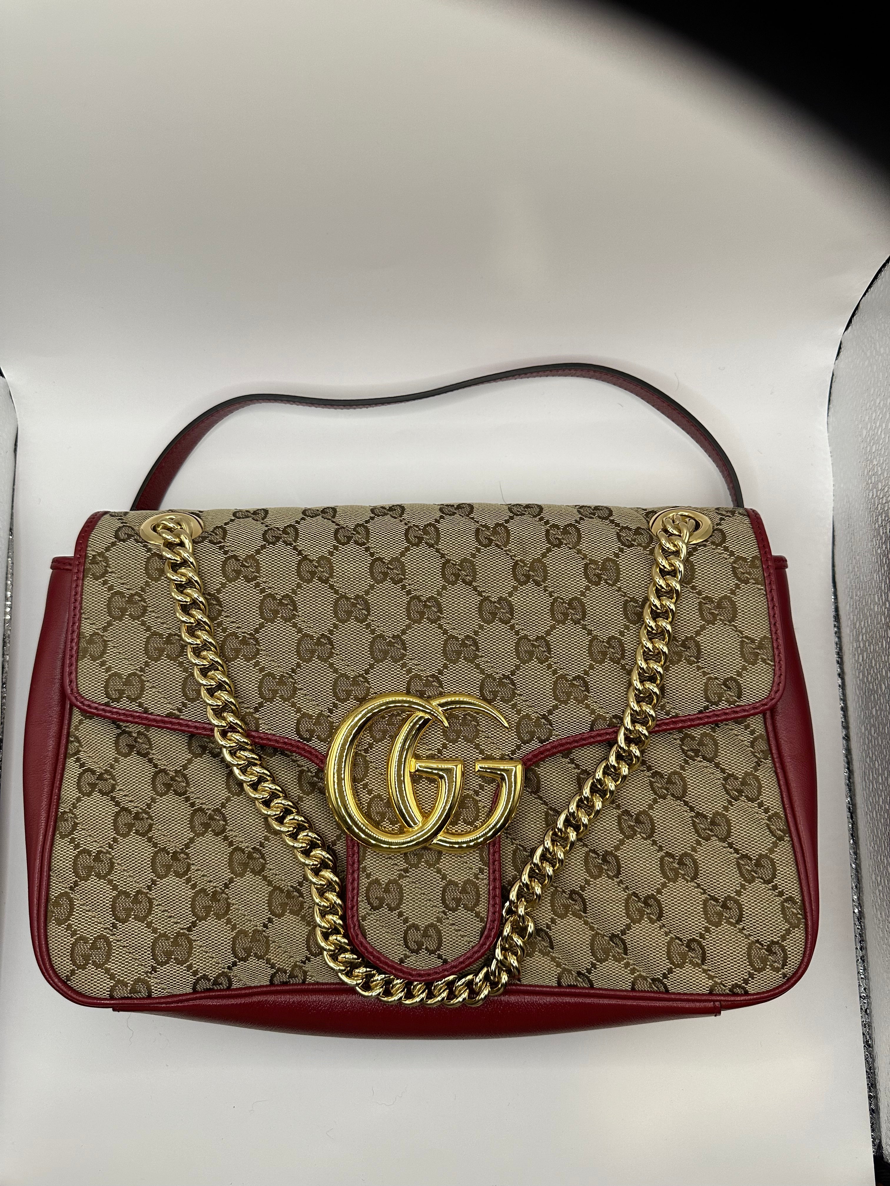 Diagonal Beige GG with hibiscus red leather trim