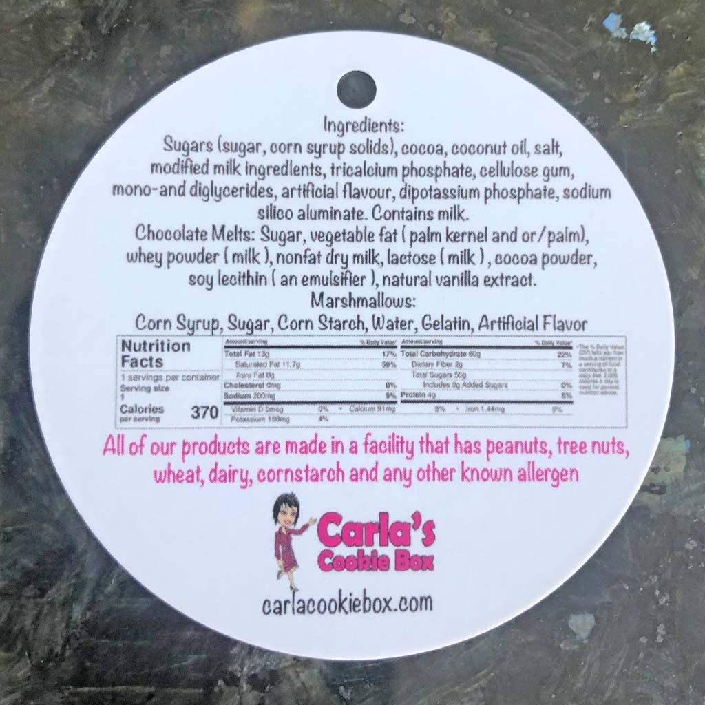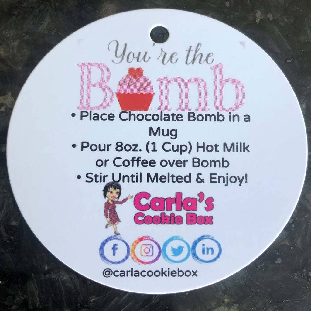 Hot Cocoa Bomb Our Hot Cocoa Bombs (seen on TIKTOK) are handmade and coated in Premium Callebaut Chocolate and filled with Gourmet Hot Chocolate and mini marshmallows. These HUGE bombs measure approximately 3 inches in diameter for a REAL treat that the whole family can enjoy. Ingredients: Callebaut Chocolate, Premium Hot Chocolate, marshmallows: . Packaged in cellophane. Labels include an ingredient list, nutritional value and disclaimers.
