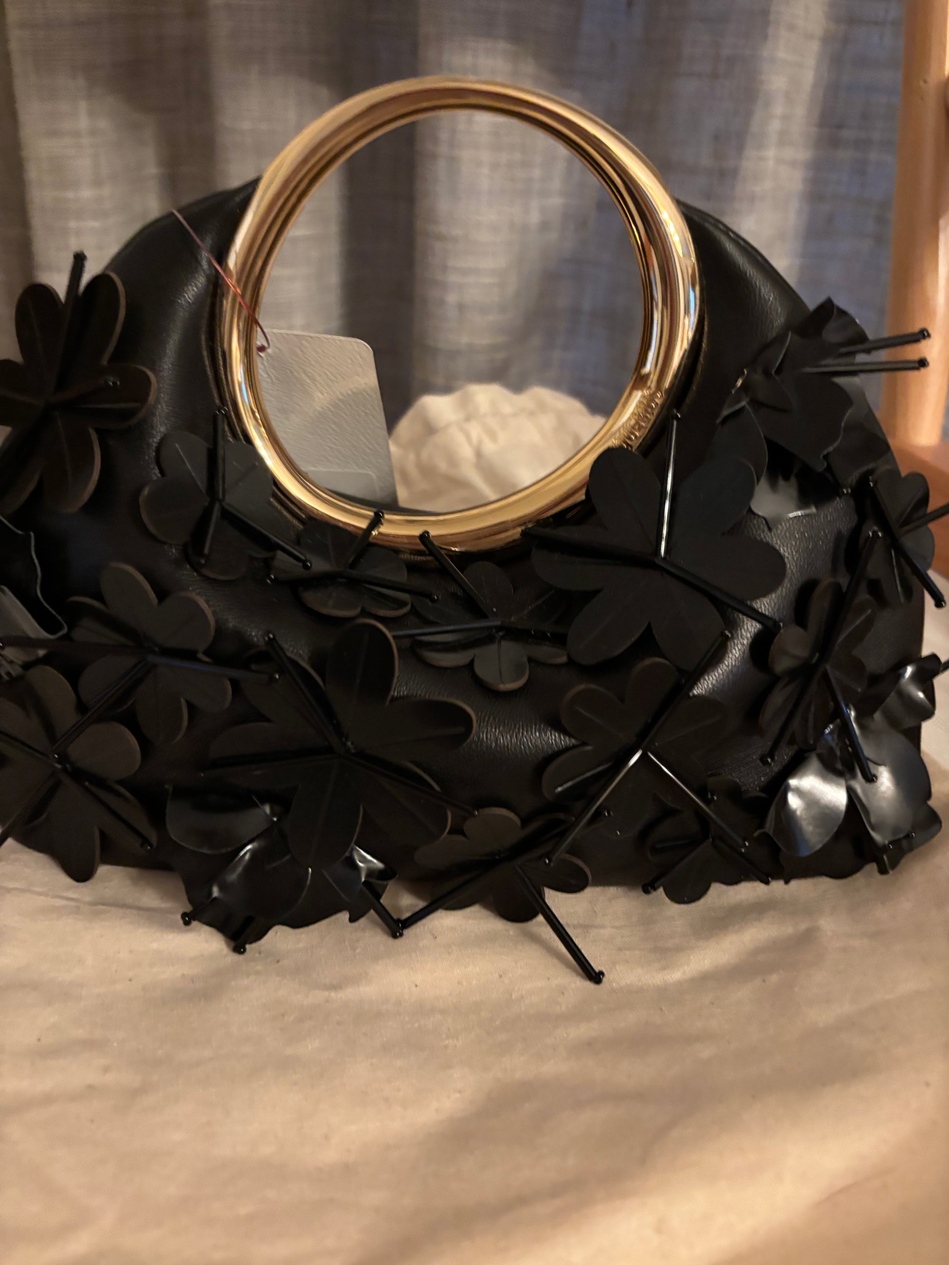 A rare and striking statement piece from Jacquemus, the Le Petit Calino Brodé Floral Appliqué Bag showcases the brand’s signature sculptural aesthetic. Crafted in supple black leather and adorned with three-dimensional floral appliqués, this limited edition design is finished with a bold gold circular top handle that doubles as jewelry.