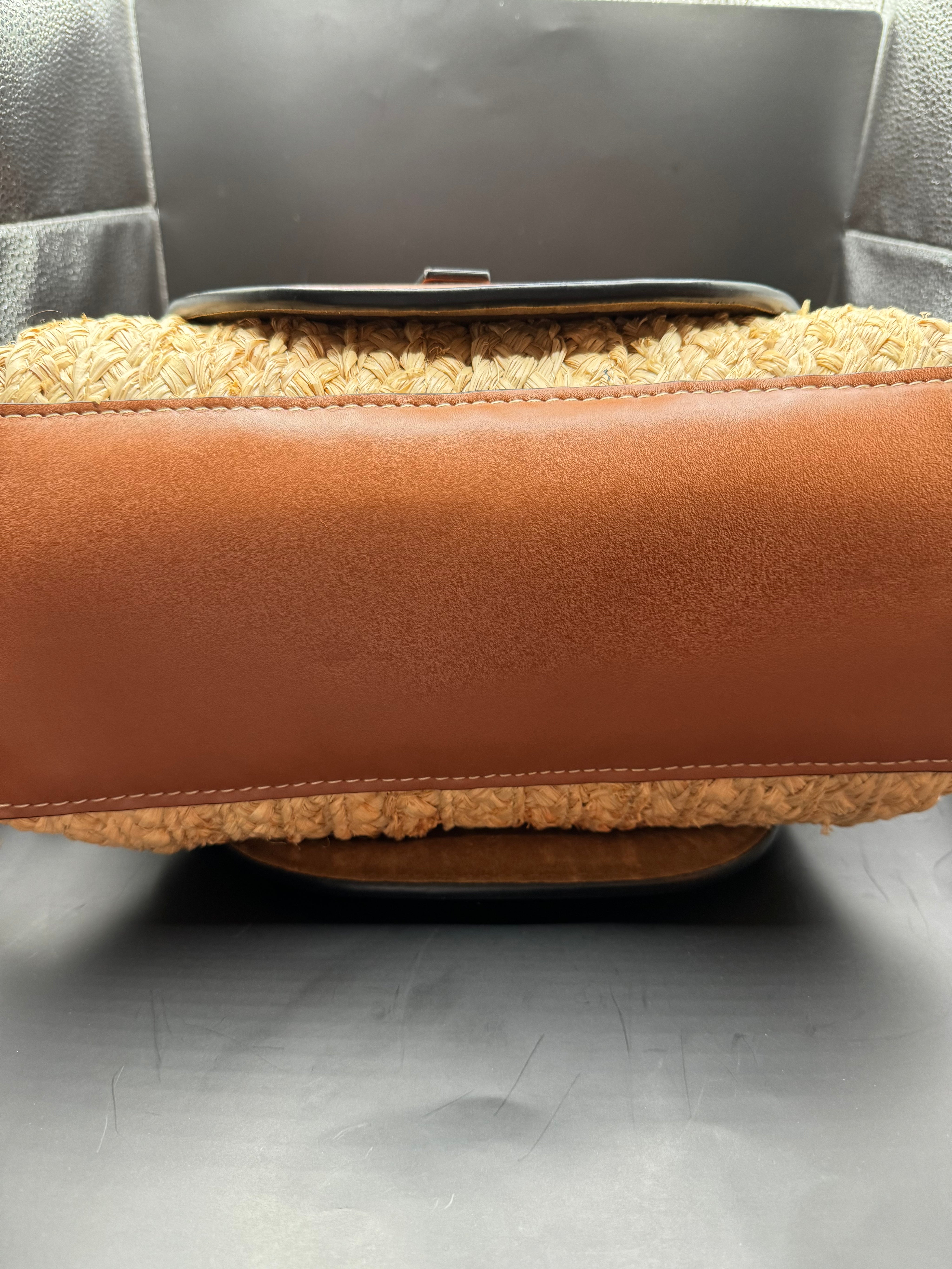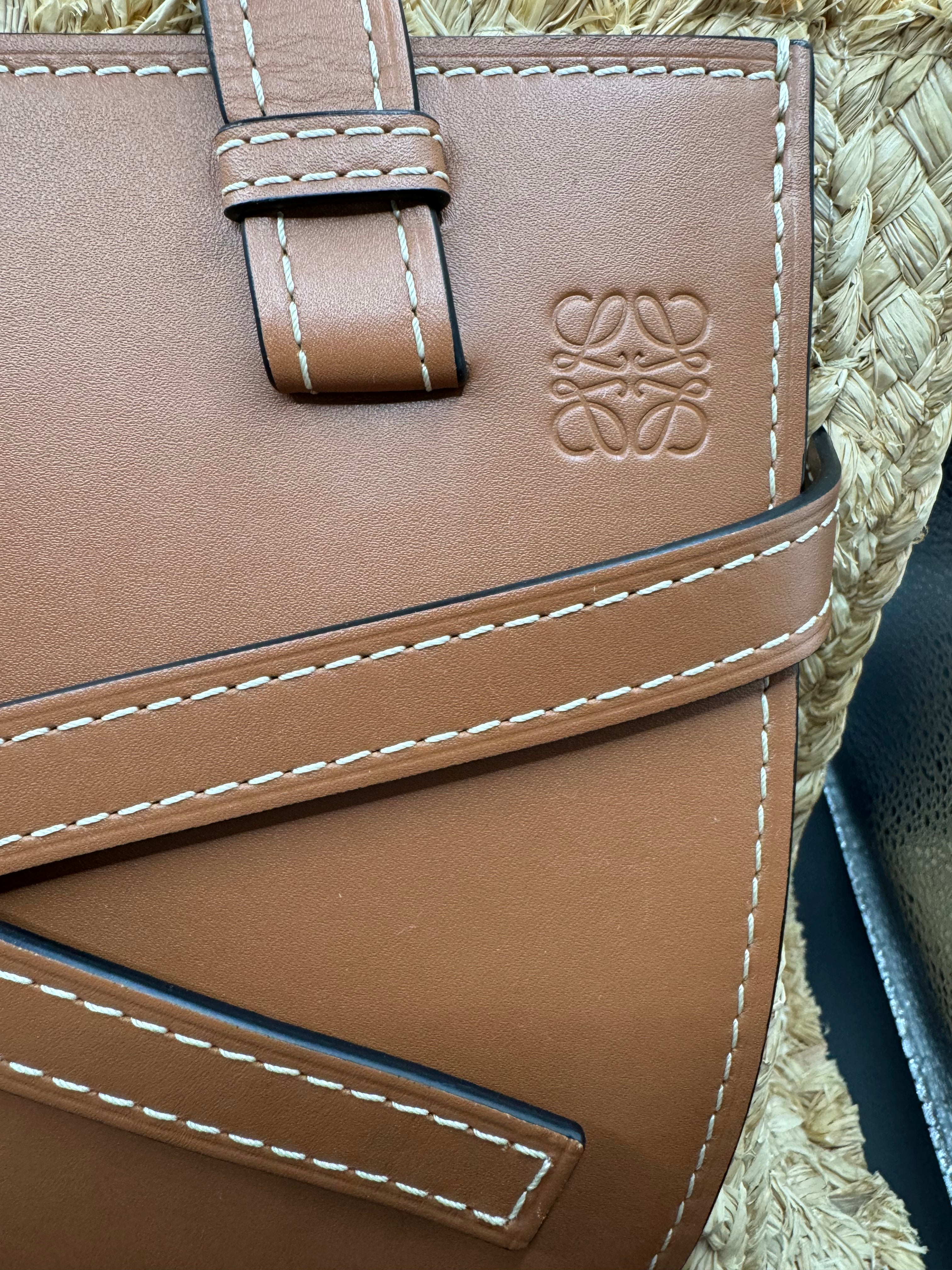Loewe Gate Top Handle handbag in beige raphia and tan leather.