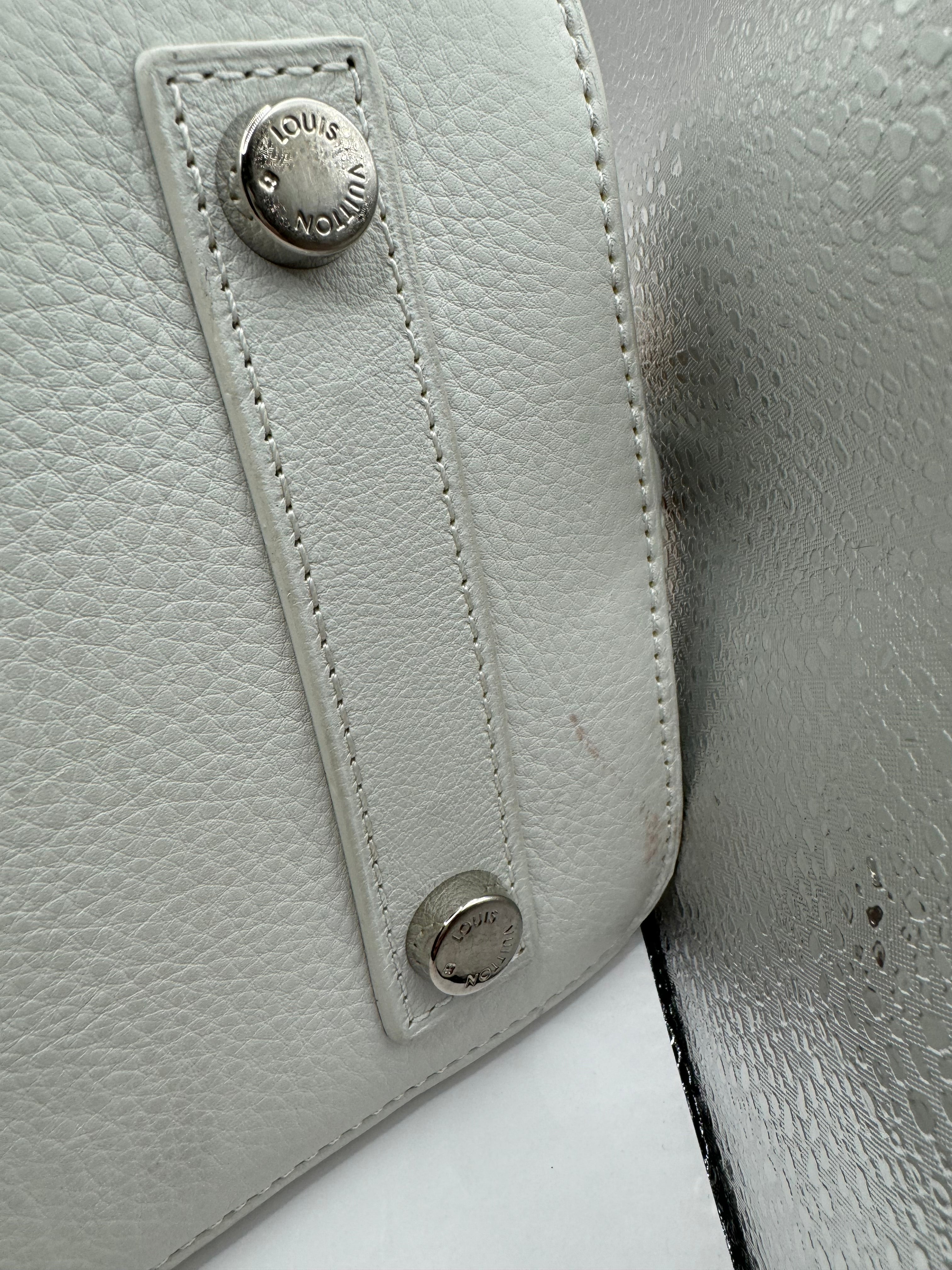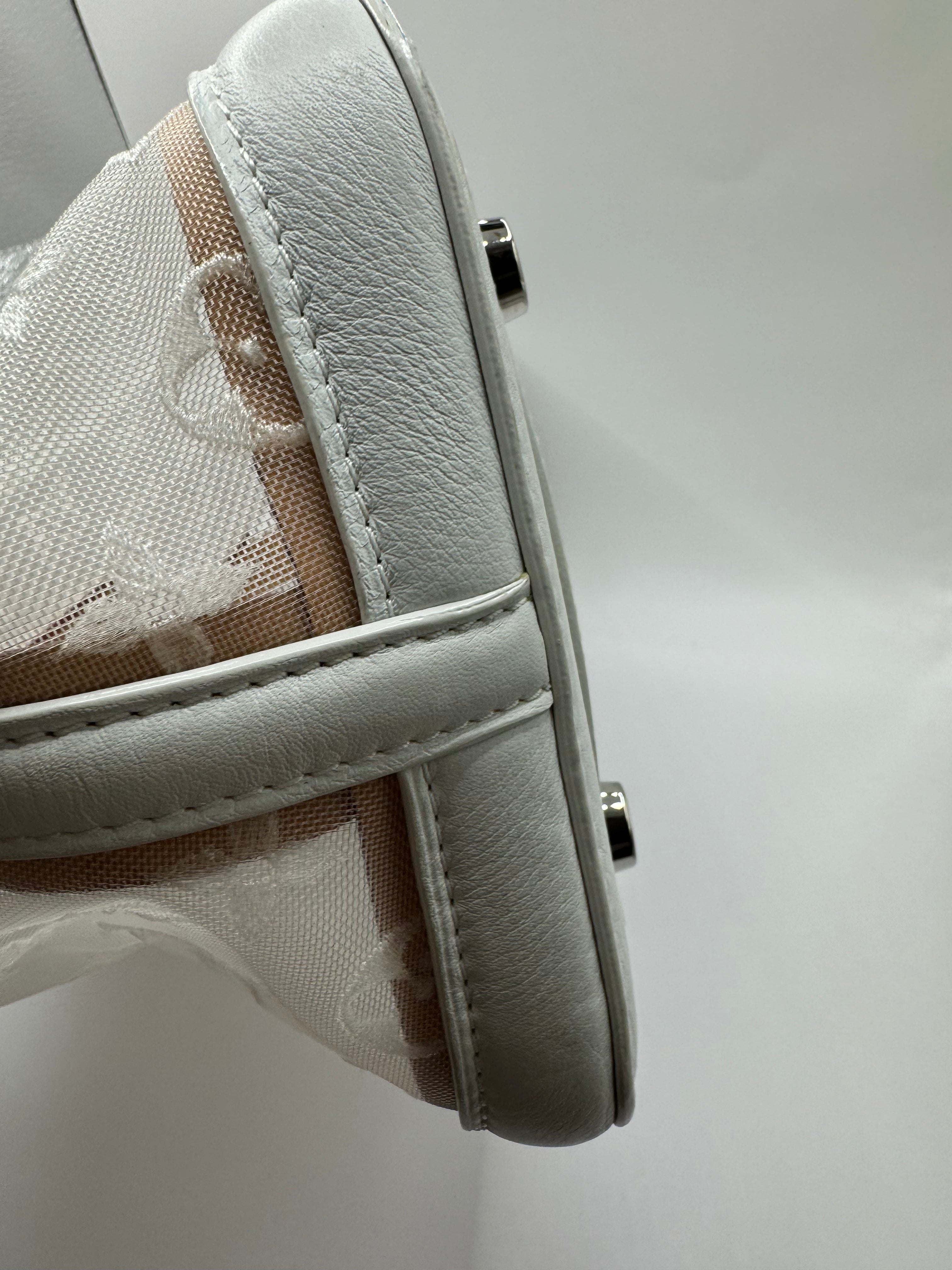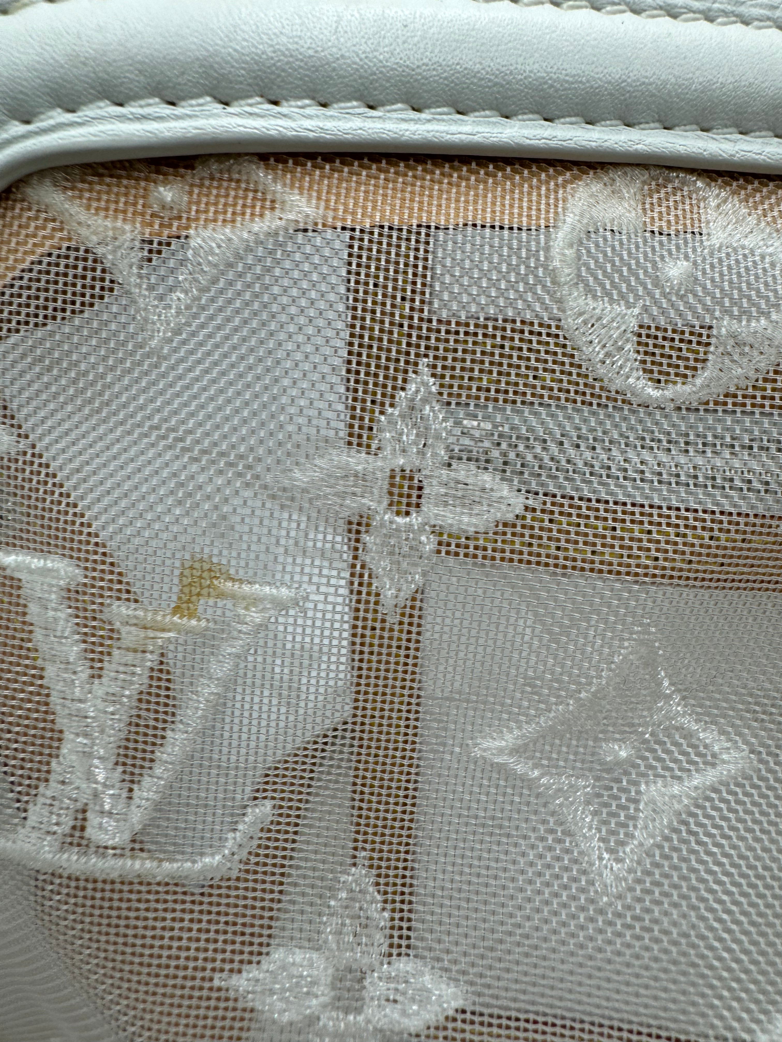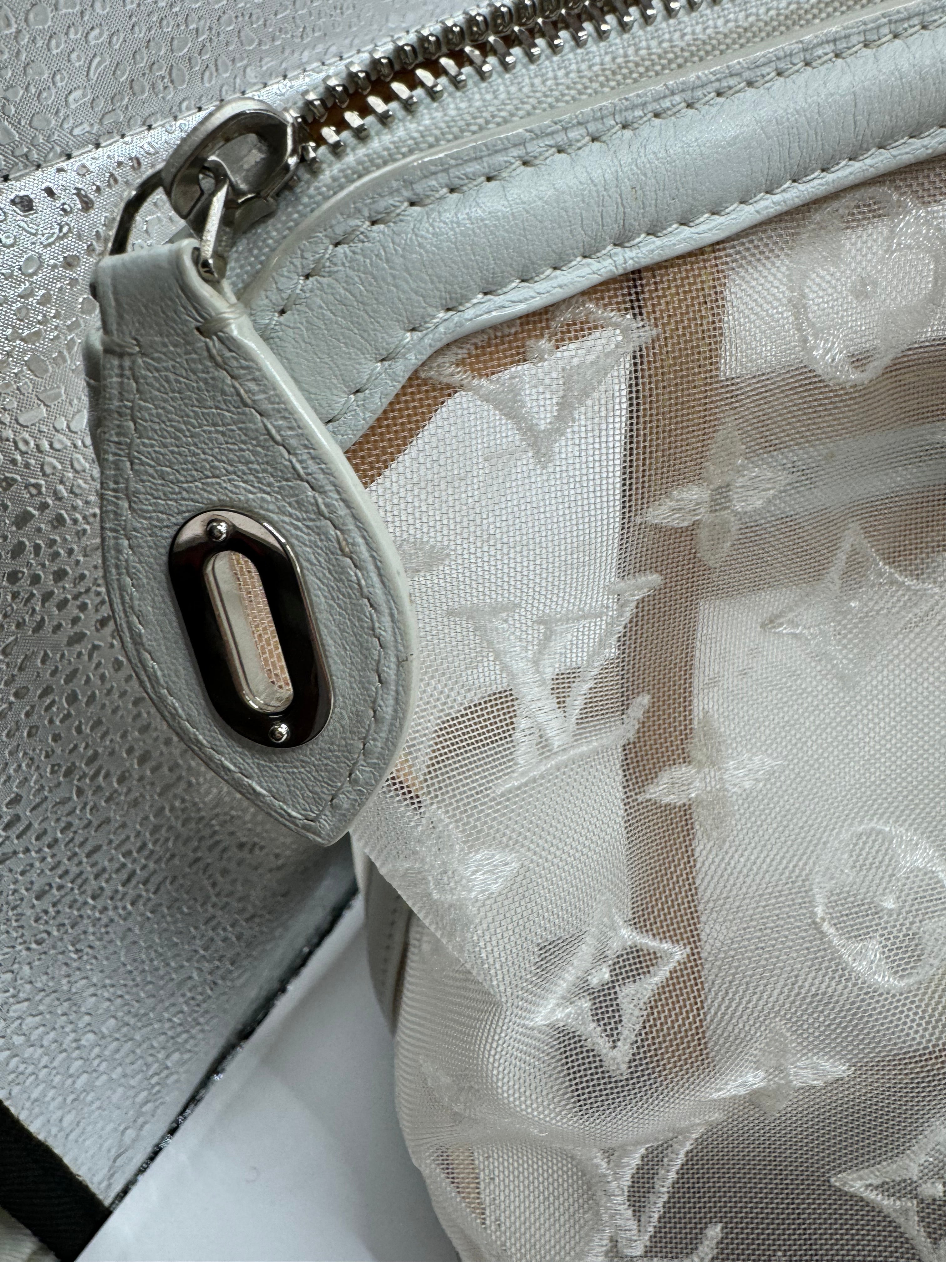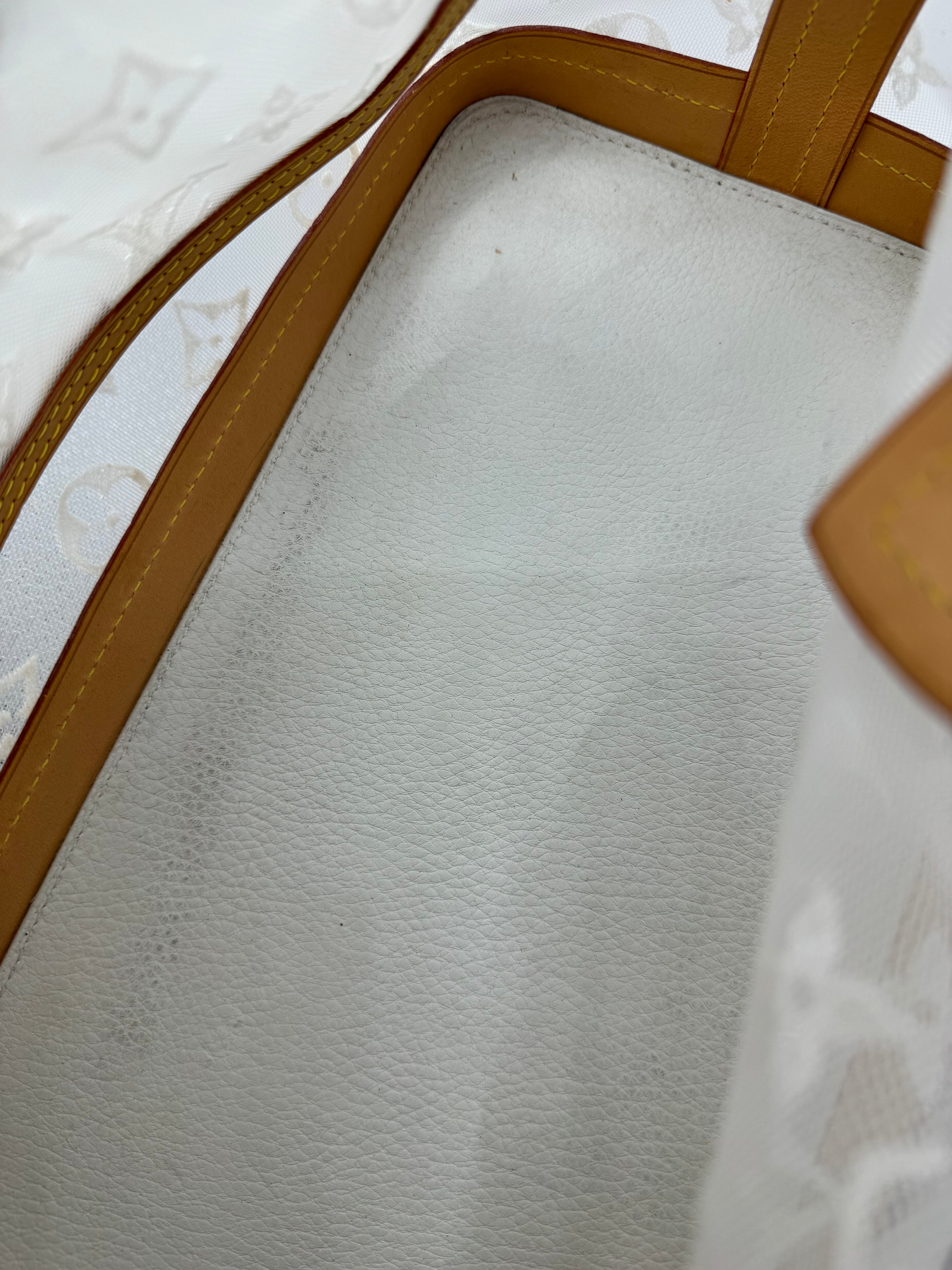 some slight marks in interior bottom and exterior bottom. Minimal mark on zipper and small spot on mesh and handle.
