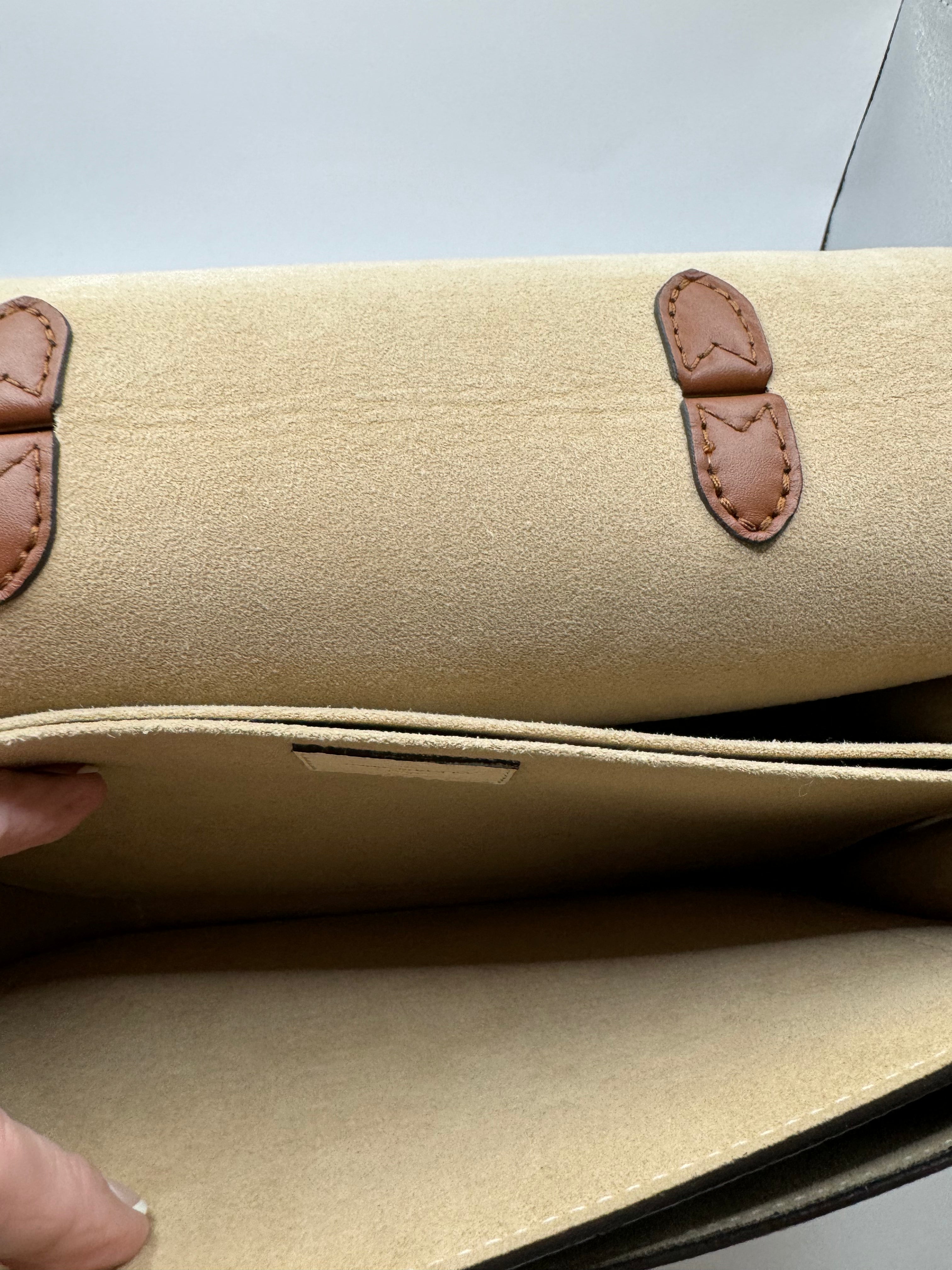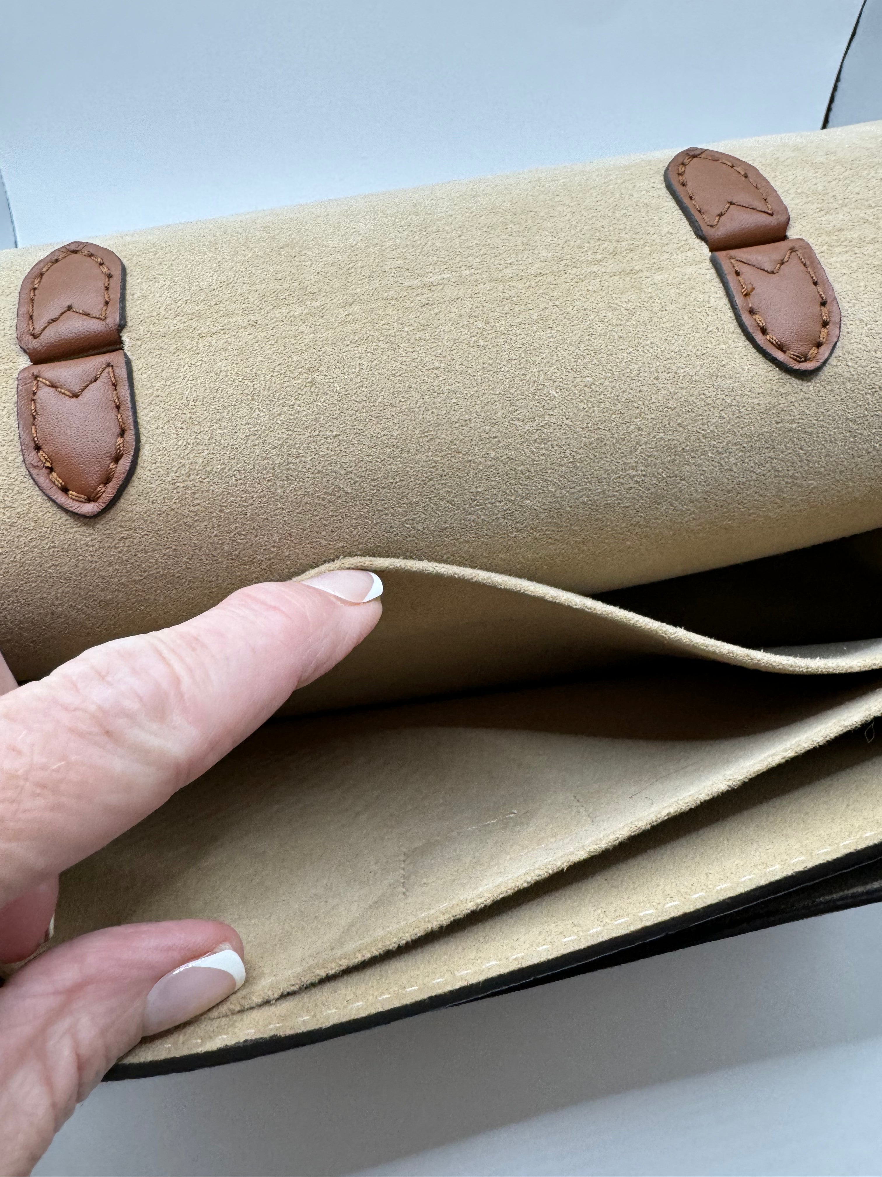 - Beige microfiber lining with two compartments, single interior open pocket in the middle and magnet closure at front