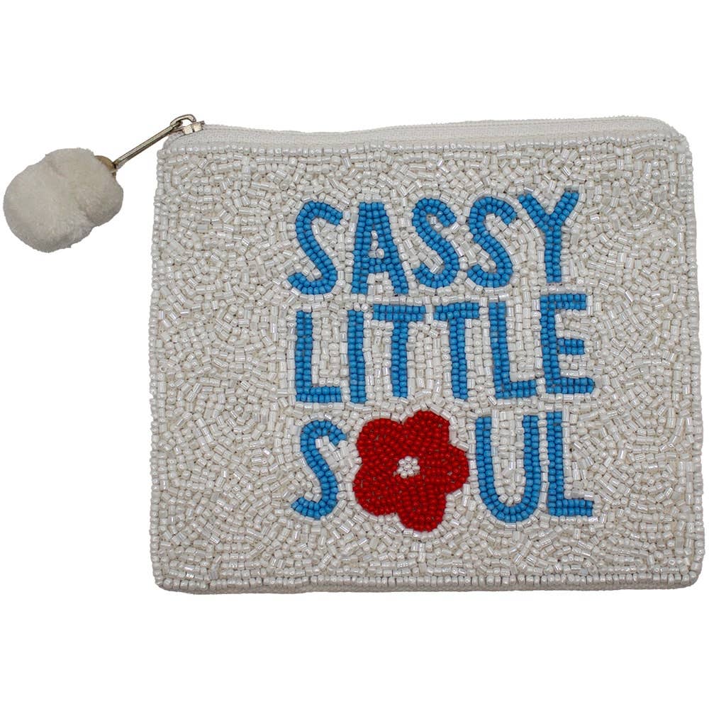 Add some playful charm to your accessory collection with the Sassy Little Soul Beaded Coin Pouch! This whimsical design features bold blue lettering spelling "SASSY LITTLE SOUL" against a shimmering white beaded background, accented by a vibrant red flower detail. A soft white pom-pom zipper pull adds a touch of fun to this handmade pouch. Perfect for storing small essentials, it's a stylish way to showcase your spirited personality.