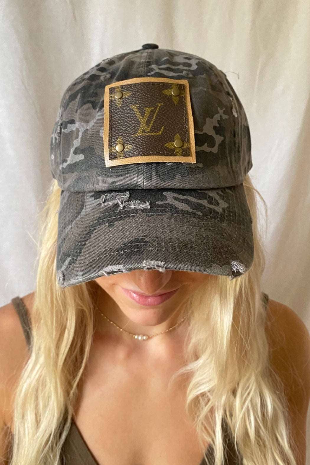 Black and gray camo vintage baseball cap with tears and frays perfectly placed is so popular. Authentic designer detail sewn on brown leather and riveted on the hat. Adjustable buckle strap. Please note that the patch may by different dimensions than shown. Antique gold rivets. Ponytail friendly. Handmade-perfectly imperfect. -Patch is securely sewn and riveted -Very Popular -Adjustable back Disclaimer: Embellish Your Life is not affiliated or associated with Louis Vuitton or Gucci or its subsidiaries. We buy authentic, vintage, pre-owned designer material obtained legally from the second-hand market and add our design to accessories. All items listed are not products manufactured by Louis Vuitton, Gucci, or its subsidiaries.