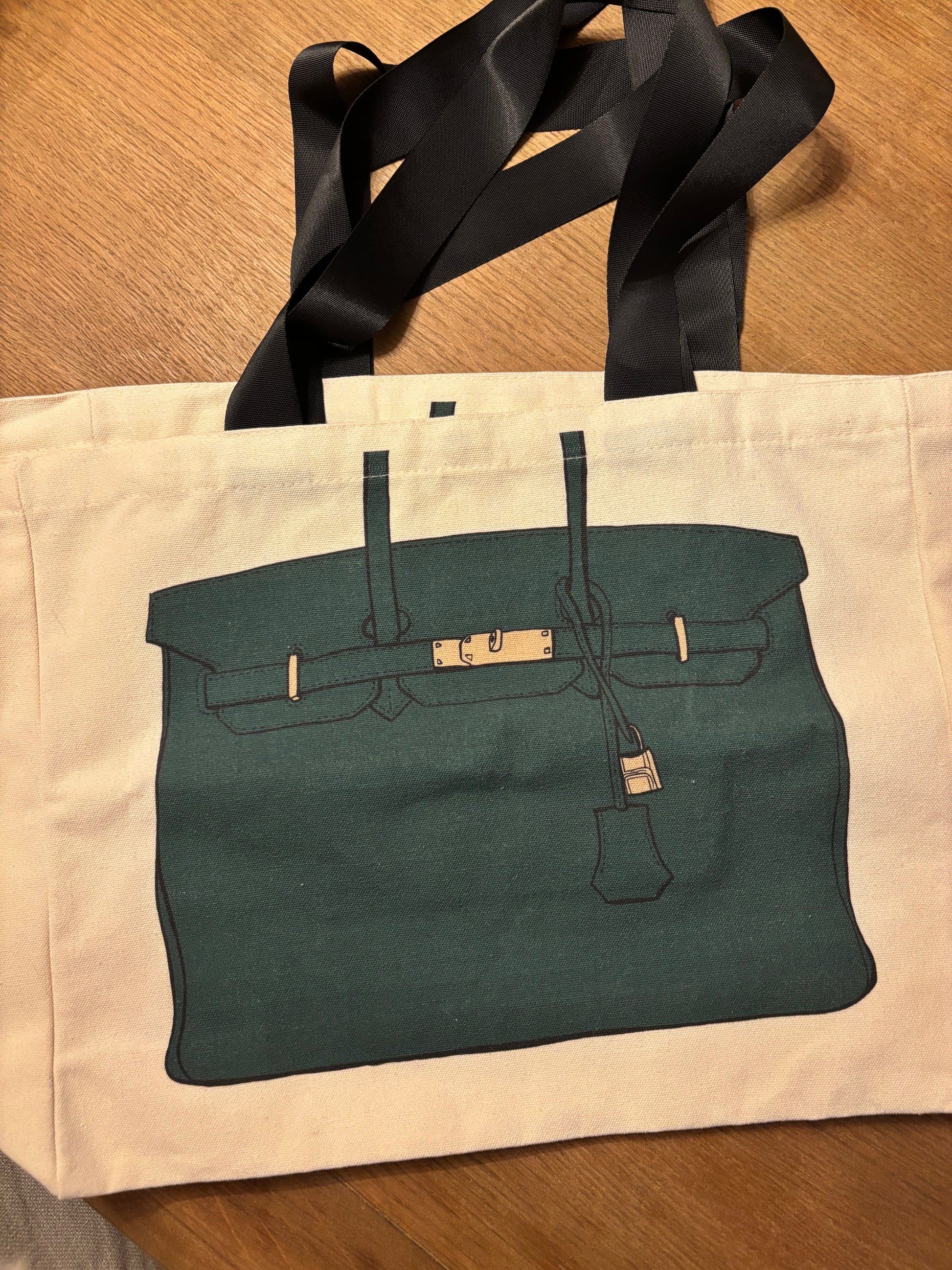 A stylish and playful canvas tote featuring a screen-printed Birkin bag design, combining practicality with a wink to luxury fashion. Durable cotton canvas with contrasting handles makes this the perfect bag for errands, work, or casual outings.